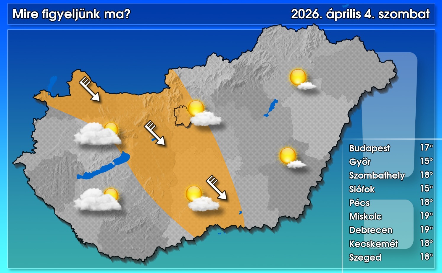 A kezdeti napos időt követően napközben megszaporodnak a felhők: egyrészt nyugat felől egy széteső front maradványfelhőzete érkezik, másrészt pedig gomolyfelhők képződnek, de csapadék nem valószínű. A keleti, északkeleti országrészben süthet legtöbbet a nap. Többfelé megélénkül, a színezett területen meg is erősödhet az északnyugati szél. A hőmérséklet csúcsértéke 15 és 20 fok között alakul.