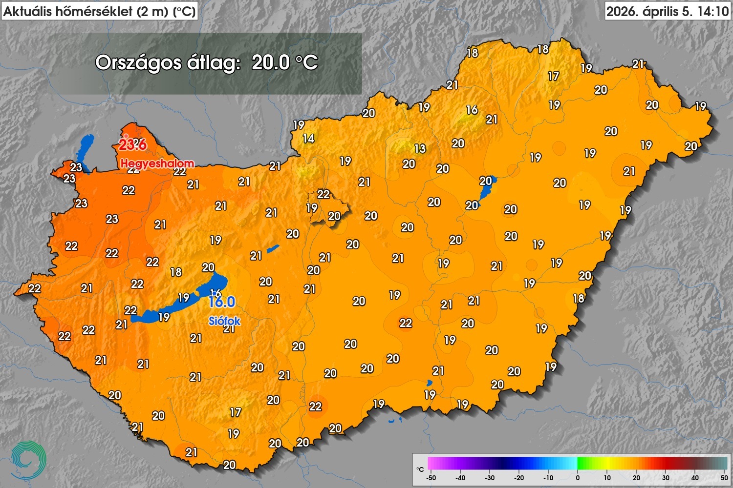 A bejegyzéshez készített infografika szerint vasárnap kora délután a legmelegebbet Hegyeshalomban mérték, 23,6 fokot, a leghidegebbet pedig Siófokon, itt csak 16,0 fok volt.