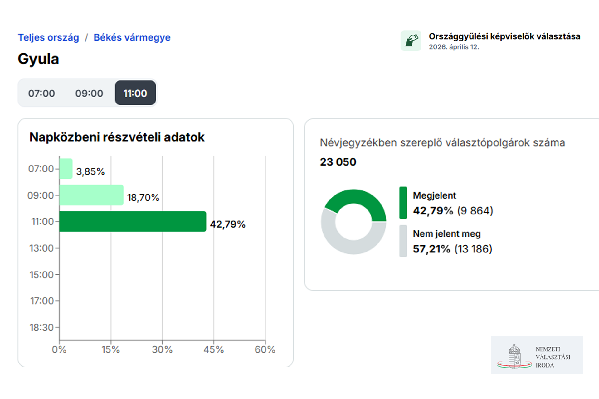 Gyulán a részvételi arány 11 órakor 42,79%-os volt. Gyulán a névjegyzékben szereplő választópolgárok száma 23 050. Délelőtt 11 óráig 9864-en adták le szavazataikat a fürdővárosban. A legtöbben a 8-as szavazókörben voksoltak.
