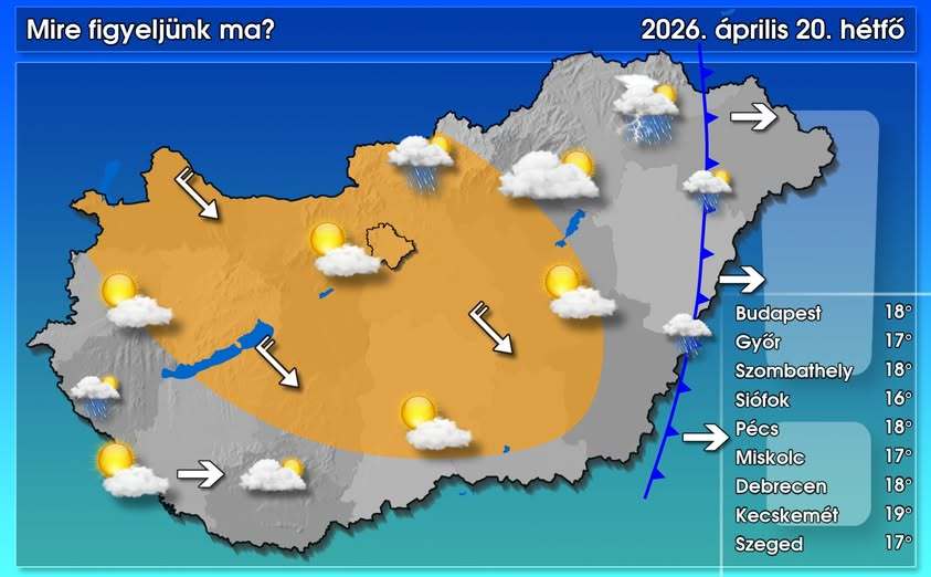 A délelőtti órákban a keleti országrészt is elhagyja a hidegfront, már csak kevés helyen okozhat kisebb csapadékot. A front mögött – a délnyugati és északkeleti tájakat leszámítva – sokfelé megélénkül, többfelé megerősödik az északnyugati szél, amit néhol viharos lökések is kísérhetnek. A feltámadó szél hatására szárazabb levegő érkezik, sokfelé naposra fordul az idő, azonban az északkeleti harmadban, illetve délnyugaton erőteljesebb lesz a gomolyfelhő-képződés, arrafelé záporok, helyenként zivatarok is kialakulhatnak. A csúcsérték 13 és 20 fok között alakul – közölte a HungaroMet NZrt.