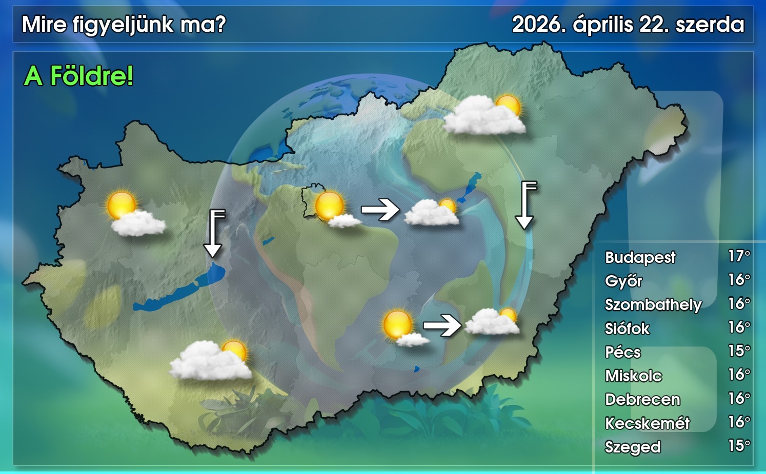 A felhős tájakon szakadozik, gomolyosodik a felhőzet, a napos részeken pedig délutánra képződnek gomolyfelhők, amelyek szétterülve jobban összeállnak, így eltakarhatják a napot. Csapadék általában nem valószínű, de főként délnyugaton még helyenként kisebb eső, zápor nem kizárt. Az északi szél sokfelé megélénkül. Délutánra általában 13 és 17 fok közé emelkedik a hőmérséklet, ami elmarad a sokévi átlagtól – közölte a HungaroMet NZrt.