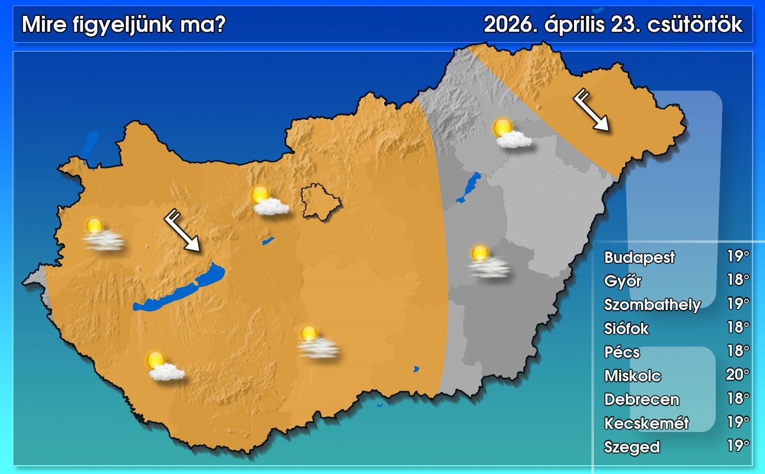 A vékonyodó, szakadozó fátyolfelhőzet mellett gomolyfelhők is képződnek, emellett sok napsütésre számíthatunk. Csapadék nem várható. A csúcsérték 16 és 21 fok között valószínű. Az északnyugati, északi szelet nagy területen kísérik erős széllökések.