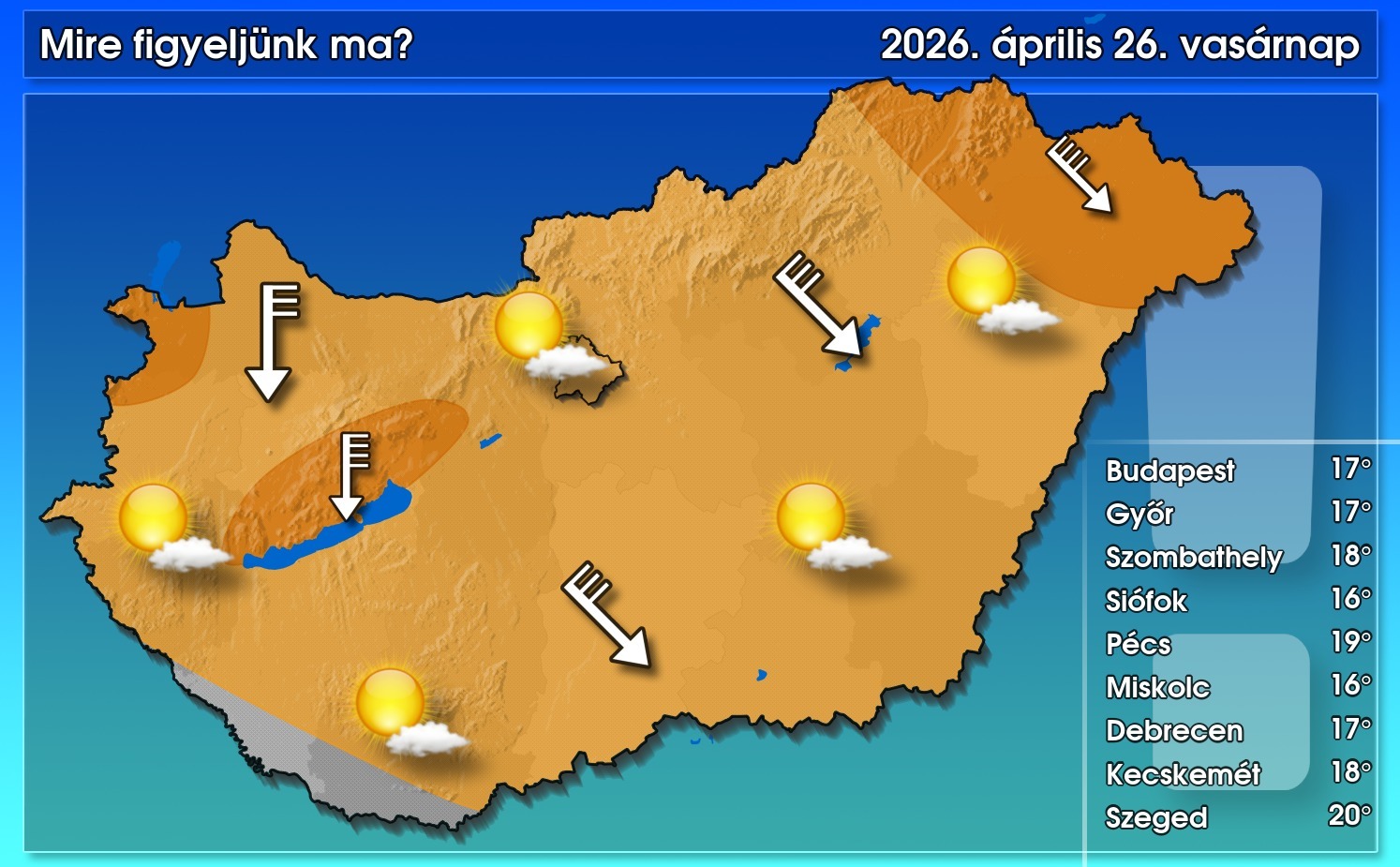 Ma hidegfront érkezik, amely szárazon vonul át felettünk, azonban nagy területen erős, helyenként – főleg az északkeleti tájakon, a Bakonyban, a Balaton és Sopron térségében – viharos széllökéseket okoz. Talajállapot függvényében egyes helyeken a port is felkavarhatja az erős, viharos szél, ez pedig a látástávolság romlásához vezethet. Várhatóan a délelőtti órákban számíthatunk a legerősebb széllökésekre, majd délután valamelyest veszíteni kezd erejéből az északnyugati, északi szél. Az esti órákban a legtöbb helyen mérséklődik a légáramlás. Mindeközben folytatódik a napos idő általában kevés fátyol- és gomolyfelhővel, utóbbiakból több északkeleten lehet, de ott is csak legfeljebb egy-egy helyen fordulhat elő futó zápor. A csúcsérték döntően 16 és 21 fok között várható, de az északkeleti vidékeken kissé hűvösebb is lehet.