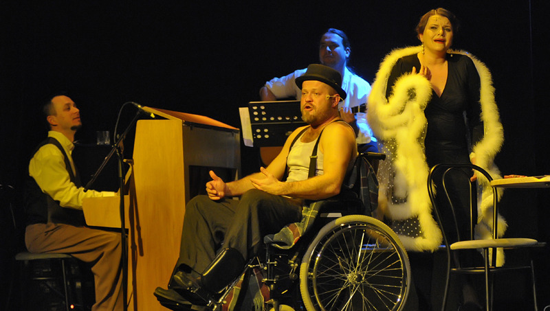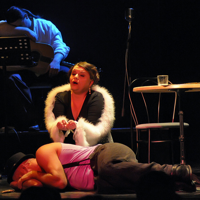 Feltűnnek a korabeli atmoszférát idéző számok, mint például a Melody, a Cocain, a Mary Jane, a Like a Hobo, a God Bless The Child, vagy az Ain’t Nobodys Bussines, amelyeket a nevéhez hűen, angyali külsőt és mozgást másoló Angie elementáris erővel, ugyanakkor érzéki finomsággal fűszerez. Győző hasonlóan energikusan és átélve adja elő monológját és sok énekest meghazudtolva brillíroz karakteréhez hű, rekedtes énekhangjával. A jól kitalált dramaturgia által a letisztult színpadkép minden eleme működésbe lép. Az egykorú bármikrofon, a whiskysüvegek, az asztalok, egy kés, majd egy kerekesszék egy-egy összehangolt folyamat elemei. Akárcsak az elsőrangú zenészek, akik igencsak fontos szereplői az előadásnak. Két zenész, a zongorista és a gitáros a baloldali bársarokban muzsikál, míg egy csavargó herflis alig észrevehetően a jobb sarokban fetreng a plakát alatt, így a darabba beleépülve, élőben hallhatjuk tőlük az odavaló dallamokat, ritmusokat, a bluest, countryt, gospelt és jazzt.