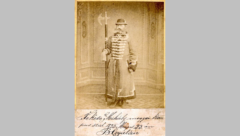 A Békés Megyei Levéltár lenyűgöző gazdagságú fényképgyűjteménye őrzi azt a megsárgult felvételt, amely egy báránybőrrel szegélyezett, paszománydíszítésű, bokáig érő bélelt kabátba öltözött idősebb férfialakot ábrázol. A XIX. század utolsó harmadában készült fotóról szakállas, csizmás, kalapos férfi tekint ránk, a kezében tartott díszbot sejteti az alabárdos foglalkozását. A lencsevégre kapott személy nem más, mint Békés vármegye kapusa, név szerint Fekete Mihály (1824–1907).
