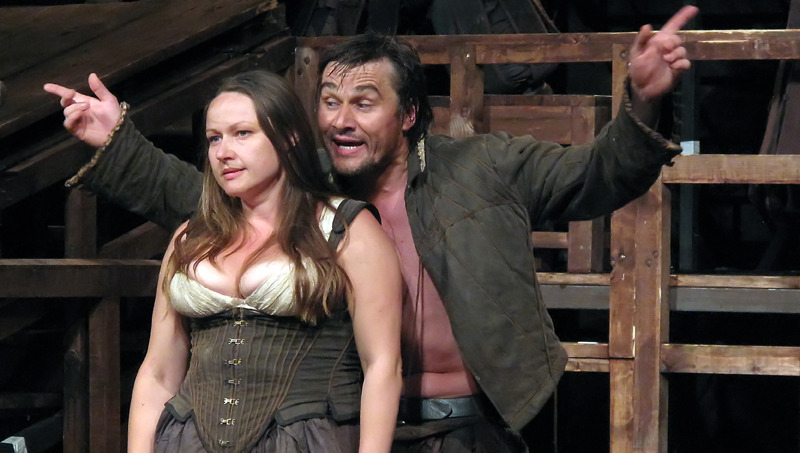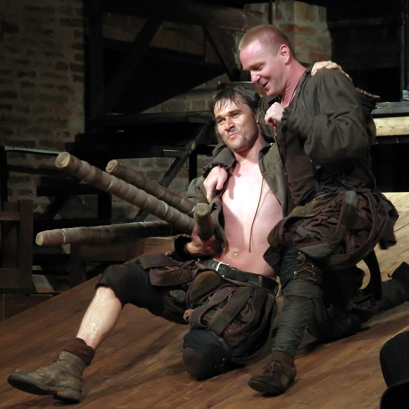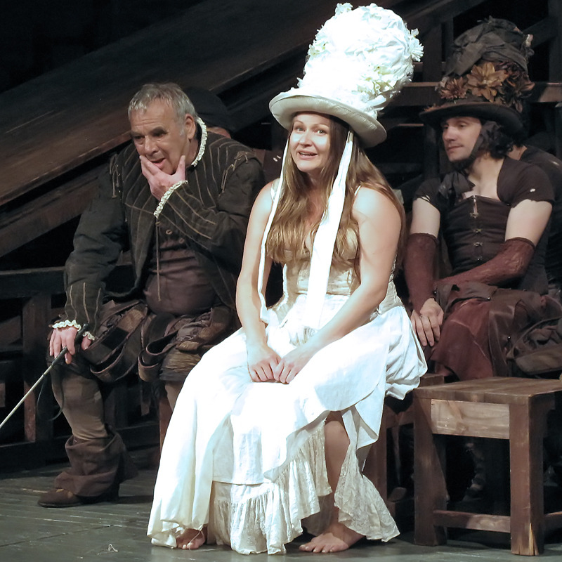 Közönségszórakoztató, hiszen a debreceniek dinamikus, akrobatikus és keményen balesetveszélyes mutatványokban gazdag produkciója csupán a játékidő hosszúsága miatt engedhette lankadni a közönség figyelmét, ám akkor is csupán egy-egy említésre sem méltó pillanatra. A talán főszereplő Petruchiót – tulajdon értelmezésében: Petrucciót – alakító Trill Zsolt az első pillanattól kezdve elementáris. Ismerjük őt, persze, régről, számtalan szereposztásban élvezhette játékát a gyulai publikum. Karakterérzékenysége, mimikája, gesztusai, egyáltalán: ereje lenyűgöző – hol úgy tekint körbe, mint egy rendes hibbant, hol úgy hozza a durva és faragatlan, de gyanús, csupán megjátszott macsó figuráját, hogy az ember gyomra ökölbe szorul tőle. Természetesen nem hagyható ki párja, Szűcs Nelli sem, jóllehet ezúttal nem tűnt annyira meggyőzőnek, ami inkább az előzetes nézői elvárás kudarcaként értendő: megformált Katalinja nem az az egyértelműen „makrancos hölgy”, akire számítottunk. Ugyanakkor alapvetően hisztis, s még gyöngédebb pillanataiban sem eléggé ellágyuló Katáját a mű zárójelenetében, a gőgös és elutasító női magatartást megkérdőjelező nagymonológgal teszi teljessé. És mehetnénk tovább, ha bírná a karakterszám. Hogy az örök-Liliomfi Rácz József Biancaként sem csalódás; hogy Kristán Attila karakteréhez kitűnően megy Tranióé, s meglehet, fordítva is így van; hogy Mercs János Lucentiója az első félórában még kérdésesnek tűnik, de aztán megtalálja a helyét; hogy a Vincentiót alakító Ivaskovics Viktor mennyire röhögtető, ha jő a helyzet a komikumhoz. Vagy hogy a sokoldalú Jámbor József milyen hitelesen hőbörög a csalódott Hortensio álarca mögé bújva. Remekül összerakott szereplői gárda az ukrán Maszlobojscsikové, látványosan értik és érzik egymást. Mintha ennek az összhangnak az allegóriája volna, ahogy Trill Zsolt a játszóknak hátat fordítva pásztázza a lelátót – minket figyel, vagyis a darabot nézi a bennünk tükrében, miközben kissé fölényesen reflektál az előadás épp játszott jeleneteire.