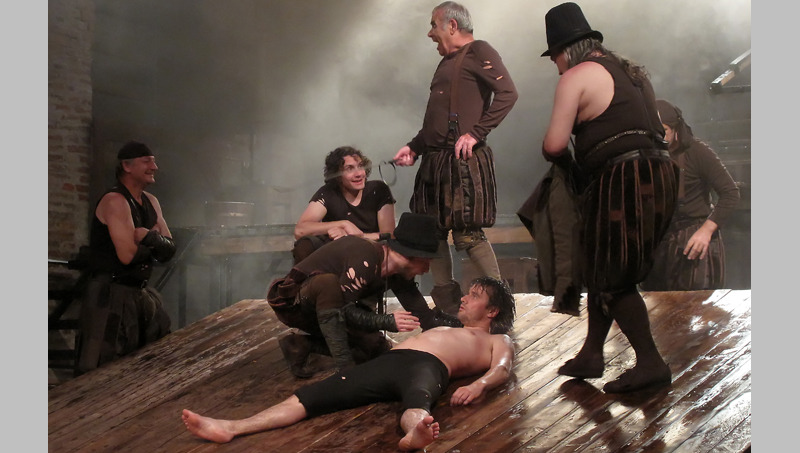 Barna kép a színpad, s rajta minden egyes színész, aki aznap este játszik. Az egységes szín- és hangulatvilágot teremtő díszletezés állandó velejárója a füst (tűz?) és a füstöt eregető mechanika szűnni nem akaró morgása – valamint a víz. Bár végig az az érzésünk, jó ötlet a két elem egyidejű jelenléte, hogy remekül illeszkednek a képbe, sőt egymáshoz, nehezen tudnánk válaszolni, ha kérdeznék, miért épp ezekre van szükség. A víz talán érthetőbb: a megtisztulás, tisztára mosás, Kata, sőt Petruchio „átmosásának” motívuma praktikus célokat is szolgál: a kerettörténet Ravasz Kristófja ennek segítségével robban be a színre, s csúszik majdnem az első sorban ülők orra elé (többen követik az est folyamán – állandó a dübögés, a zaj), és józanodását is vízzel érik el játszótársai. A füst problémásabb, fejtörőbb ügy. A fénnyel összejátszva szép pillanatokat produkál, némely színész alakja pedig úgy sejlik föl a tornácon, akár a szárazjégből előbukkanó rocksztáré. Ha pedig elérkezünk a darab történetvezetésében, fő vonásának tekinthető állandó szerep- és helycseréiben jelentkező homályig – nem látni tovább.
