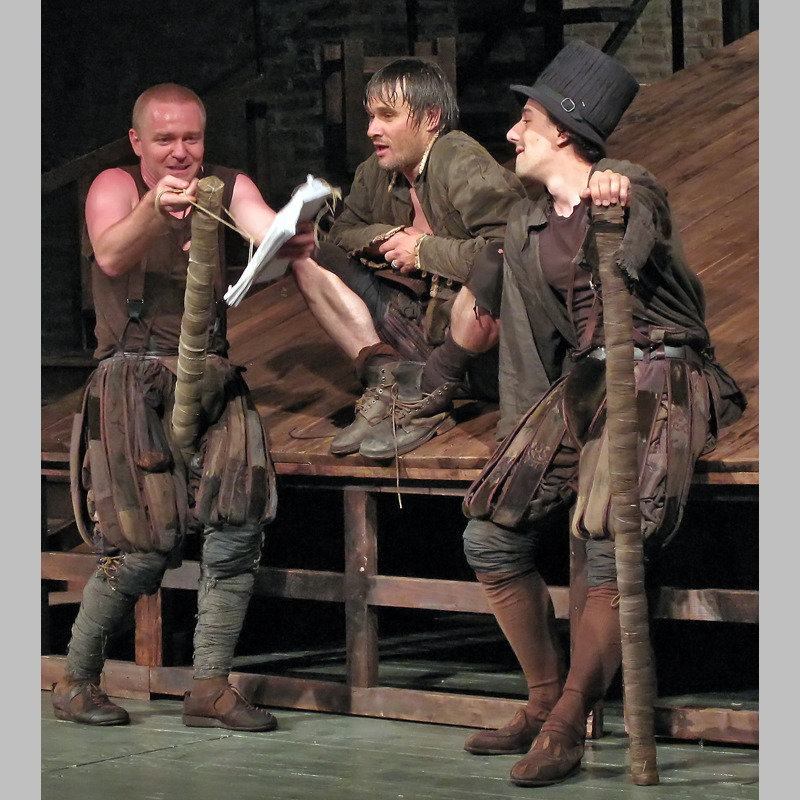 S ha már olvasat: a Maszlobojscsikovéban tizenegy színész viszi a harmincegy (!) szereplőt. A játék közben és a szünetben alig-alig módosított, inkább csak igazgatott díszlet korlátai közé szorított játéktérben – az eleve adott átöltözéseken, átlényegüléseken túl – olyan kavarodások is történnek, amelyek nem könnyítik meg a befogadást, ha az előrelátó néző nem pörgette át magában A makrancos hölgy sztoriját. Mondjuk, Jékely Zoltán klasszikus fordításában – az eredetileg Debrecenben színre vitt, s most Gyulán is hallott friss szöveg tolmácsolója a kiváló költő és nyelvész, Nádasdy Ádám. Egyszóval néhol kuszának tetszik, amit látunk, pedig minden klappol: nem győzünk csodálkozni, hogy a lazán eldobott alma biztosan landol a pulpituson állók egyikének kezében; hogy a magasba hajított sokszimbólumú bot sosem esik földre – de az érezhető improvizációk, a ritka nyelvi és nem nyelvi botlások korrigálása, kihasználása is korrektül működik.