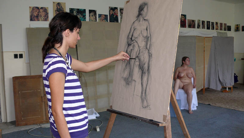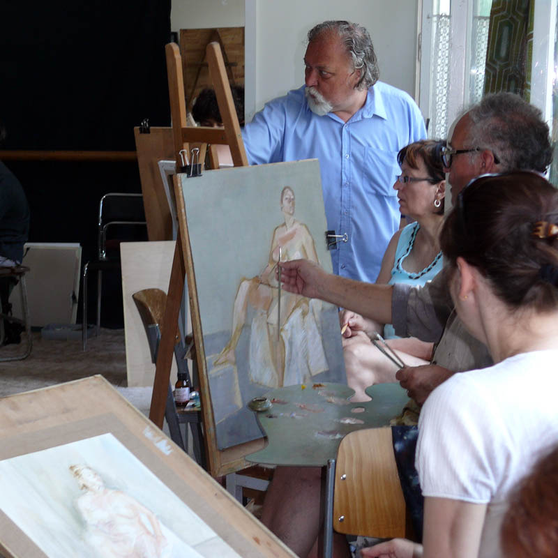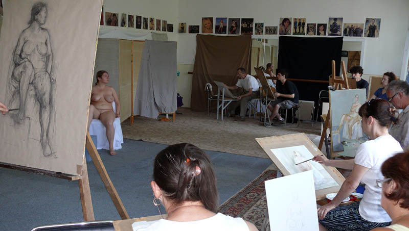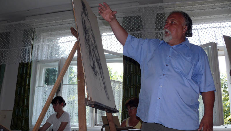 – Bár megvan a törzsgárda, az évtizedek során változott az összetétele a művészcsoportnak. Az alapító tagok néhány kivételével most is itt vannak. Végeztünk egy előzetes környezetfelmérő programot, ami abból állt, hogy szó szerint bejártuk a várost, és olyan témákat kerestünk, amiből később meg lehetett állapítani, hogy az nem véletlen. Tehát ismerkedvén Gyulával, szép lassan kialakult a mára már sajátunkká vált témakör, és azt lehet mondani, hogy egy festészeti programot hoztunk létre. Ez nyomokban negyven éve kezdődött, a java ideje majd’ húsz évvel ezelőtt volt. A természetszemlélet, a tanulmányozás menete az aktrajzolással kezdődik, az első időszakban leképzés történik. Később, megfelelő átírással, lírával vagy drámával módosul, gazdagodik, és akár képzőművészeti teljesítmény is lehet belőle. A lényeg, a tanulmányozás, mely az utcákra is kiterjedt. Nem sémák szerint ábrázoltuk a tájat, a várost, hanem egész pontos képe szerint. Lényegében ugyanazt tesszük a modelleknél a városban, mint bent a műteremben. Nem módosítjuk, nem idealizáljuk a helyzetet, hanem igazi valójában festjük meg, ahogy mindenki láthatja. Ezért mondható realisztikus valóságábrázolásnak, a tanulmánymunkánál is az alaposság a programunk. Ennek az a szerepe, hogy ha az ember megszokja, hogy azt ábrázolja, azt fogalmazza meg, amit lát, és ami előtte van, annak az értékét minden téren, színben, formában megtartja és kiemeli. Épp az a baj, hogy sok helyen, iskolákban, szakkörökben viszonylag kevés időt szánnak rá, nem kap elég hangsúlyt, így nem tud kialakulni a szemlélet – hangsúlyozta Balogh Gyula, majd a modellek kiválasztásáról beszélt.