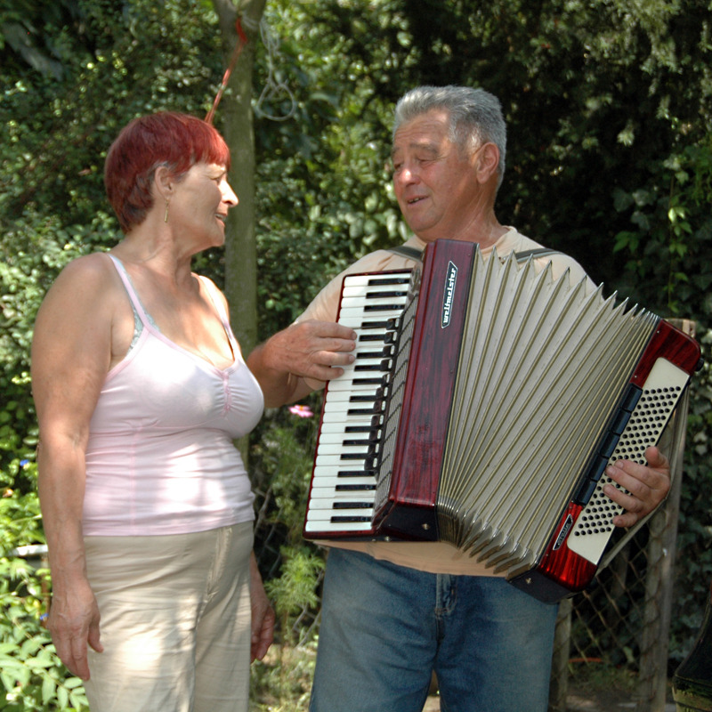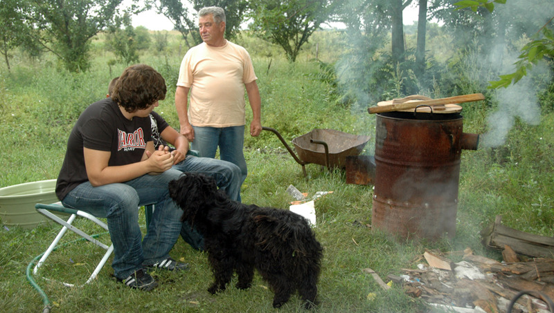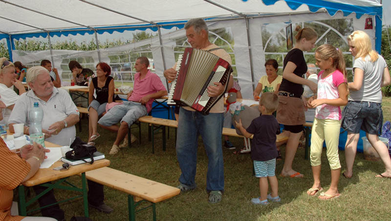 Amikor a nap delelőre hágott, elkészült a birkapörkölt, amit jó nagy adagokban, finom, csípős savanyúsággal tálaltak a vendégeknek. Ekkor ízleltem először csillagtökből savanyúságot! A barátságos keverék kutyusok ezután még nagyobb hízelgéssel lődörögtek a környéken, dicsérve ezzel a főszakácsot, Csordás Józsefet, aki hamarosan megjelent egy tangóharmonikával, hogy unokáját követve egy-egy nótával szórakoztassa az idősebb korosztályt is.