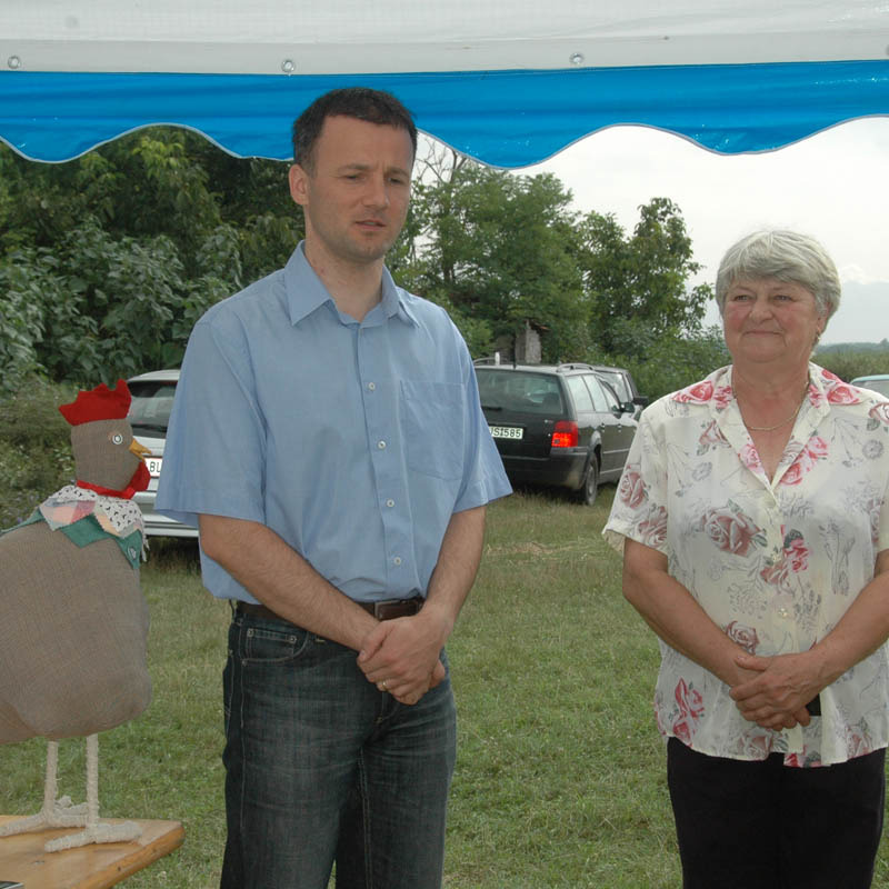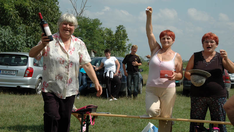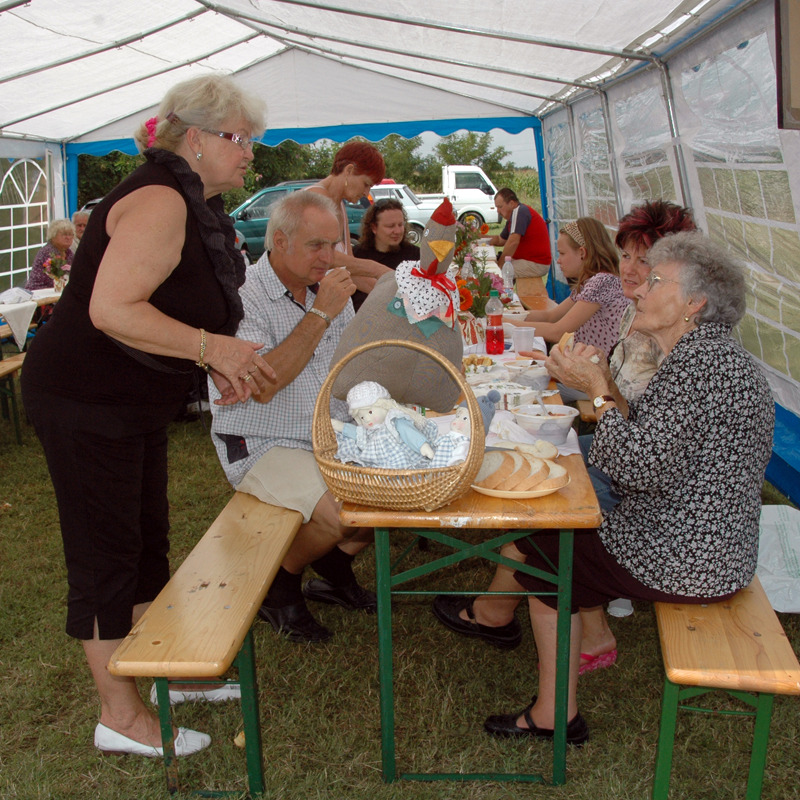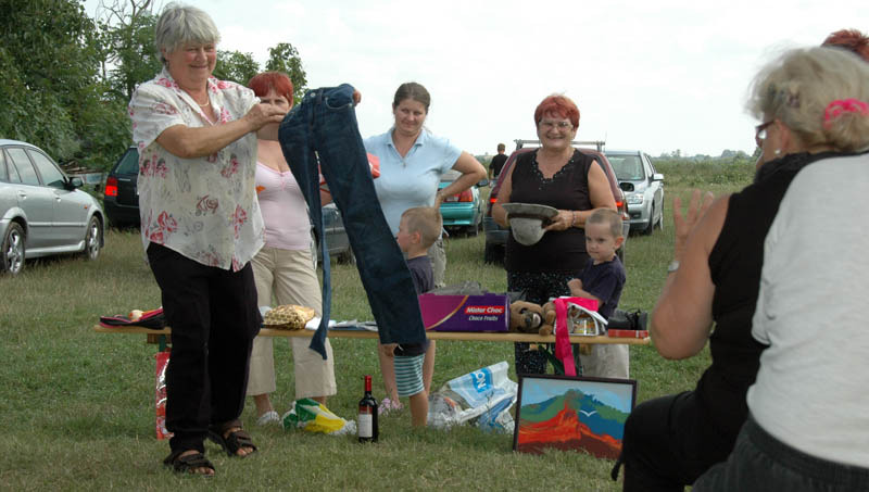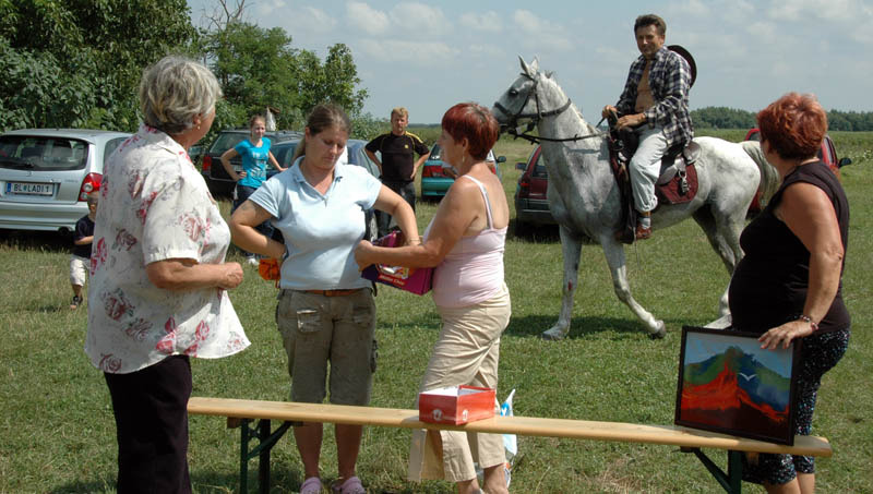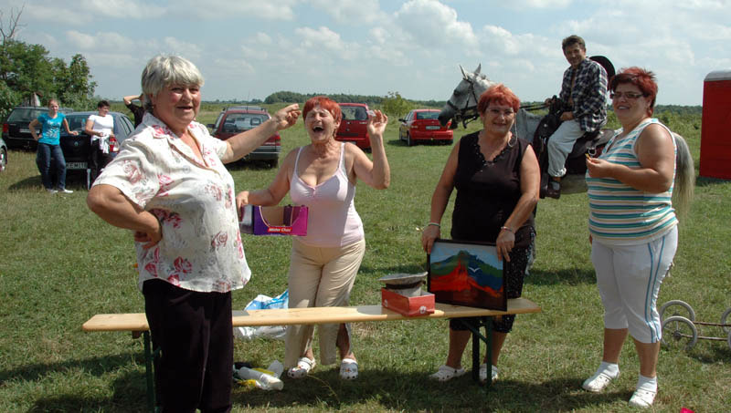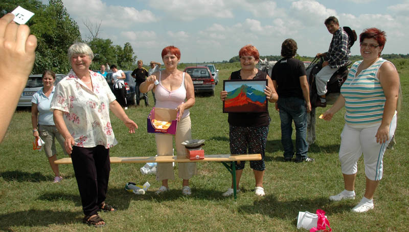A nagy, árnyékot adó sátorról lekerült a hűsítő szellőt átengedni nem akaró fala, mire elkezdődött a sokak által várt tombola. A számos hasznos ajándék – ruházat, bor és játék – között a legértékesebb egy Póka-alkotás volt, a fődíj pedig egy kismalac. Elnyerésüknek lehetősége fokozta a tombolahúzás izgalmait. Azért örülök, hogy nem mi nyertük a kucut, biztos rosszul érezte volna magát a panelben. Mi viszont annál jobban őt…