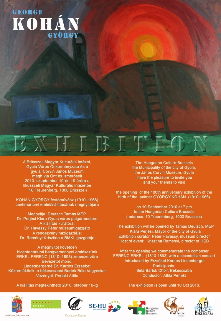 Gyula Város Önkormányzata és a Corvin János Múzeum szervezésében Kohán György centenáriumi emlékkiállítás nyílik szeptember 10-én a Brüsszeli Magyar Kulturális Intézetben. A tárlatot Deutsch Tamás és dr. Perjési Klára nyitja meg.