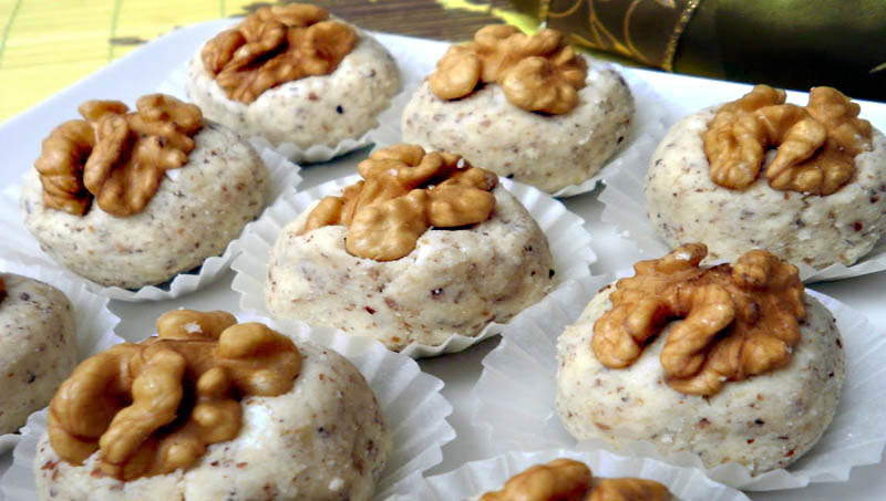 A megmosott csirkemelleket sós vízben puhára főzzük. Lapátkanállal kiszedjük, hagyjuk lecsepegni és langyosra kihűlni. A húst kicsontozzuk úgy, hogy négy szeletet kapjunk, majd mindegyiket először lisztbe, kevés sóval felvert tojásba, végül a durvára vágott, vagy darált dióval elkevert zsemlemorzsába forgatjuk. A bepanírozott húsokat forró olajban kisütjük, majd gyümölcskompóttal körberakva tálaljuk.