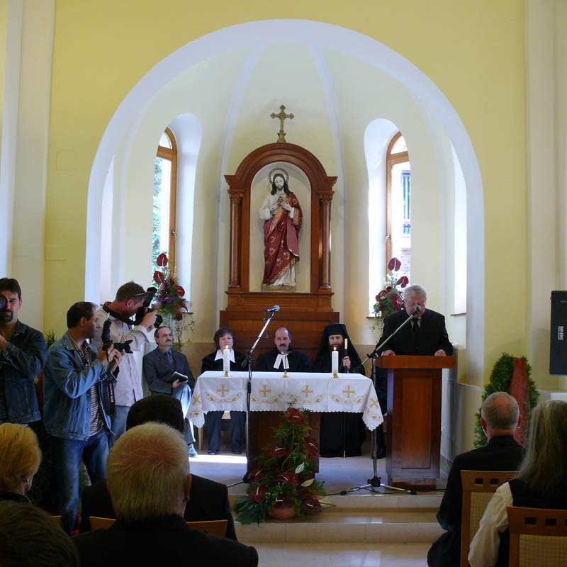 Dr. Kovács József főigazgató főorvos a kápolna több évtizedes történetét ismertette. Történelmi források bizonyítják, hogy a városi, megyei és kórházi közügyekben mindenkor részt vettek az egyházak képviselői mint fontos közéleti személyek. Békés vármegye magánkórháza 10 ággyal 1846-ban kezdte meg működését. A kórház fejlődése hamarosan szükségessé tette egy katolikus kápolna létét. A kápolna gondolata először 1898-ban vetődött fel, ennek érdekében a kórházi bizottság küldöttséget küldött Salamon Lőrinc nagyváradi bíboros püspökhöz, melynek vezetésére a főispánt kérték meg és arra, hogy Wenckheim–Almásy grófi családokkal együtt katolikus kápolnát építsen, és hogy a bíboros ezen kápolnában a papi funkciók teljesítésére egy káplán fizetését vállalja magára. A bizottság sikerrel járt, de az építés és berendezés költségeit gróf Wenckheim Frigyes és felesége, Krisztina, Wenckheim Géza és gróf Wenckheim Dénes vállalják magukra, 1899-ben 4000 forintot meghaladó költséggel felépítik és berendezik. A kápolnát Schneider József gyulai építőmester építi fel.