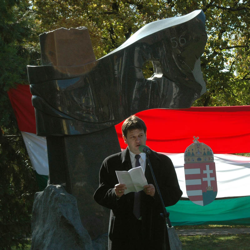 Tisztelt Emlékezők! Én egy szerencsés generációnak vagyok a tagja. Mások kiharcolták nekem a szabadságot, és ismerhetem az igazságot. Köszönet érte mindenkinek, aki a rendszerváltás előtti diktatúrát megtörve elhozta számunkra ezt a pillanatot. De az igazság mellett még mindig kísért a múlt árnyéka: a hazugság még mindig itt él velünk. Mert a jelenlegi országgyűlésnek nemcsak Wittner Mária és Horváth János a tagja, hanem olyan ember is, aki 2006 őszén hazugságaival együtt lelepleződött, majd attól való félelmében, hogy elveszíti hatalmát, az ’56-os forradalom 50. évfordulóján a békésen emlékező embereket gumilövedékekkel, könnygázzal, vízágyúkkal feloszlattatta. Olyan ember, aki ezen cselekedetei után négy évvel, 2010. október 23-ára, a mai napra időzíti új platformjának a megalakítását, és annak nyilvános bejelentését. ’56 hőseinek a szellemiségét, azt az utat, amelyen ők elindultak, így nehéz lesz követni.
