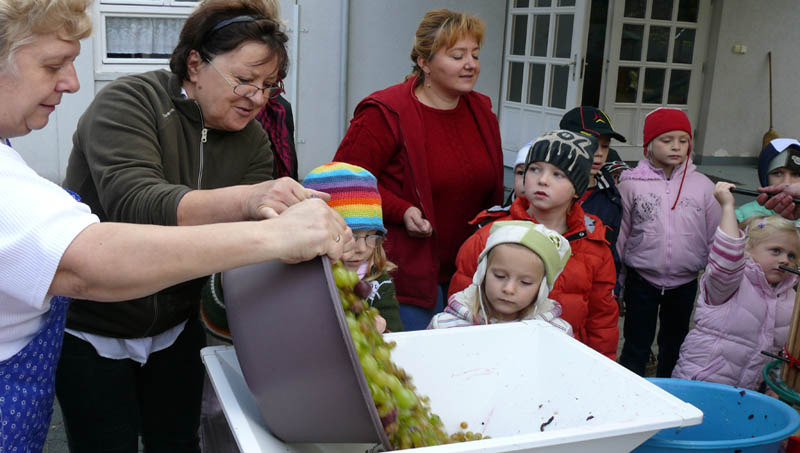 Idén újdonságként budapesti tanulmánycsoport látogatta meg az intézményt, hogy bepillantást nyerjen a helyi nemzetiségi óvoda életébe. Fazekas Sándorné tagintézmény-vezető elmondta, mind a gyümölcsöt, mind az ételek alapanyagait a gyermekek szülei biztosították, amelyért köszönet illeti a családokat. Hozzájárulásuk nélkül nem valósulhatott volna meg a szüreti mulatság. A németvárosi hagyományok mellett a gyerekek megismerkednek a szőlő, valamint a babgulyáshoz való zöldségek tulajdonságaival, ízével, színével, formájával, hiszen saját maguk dolgozzák fel az otthonról hozott alapanyagokat.