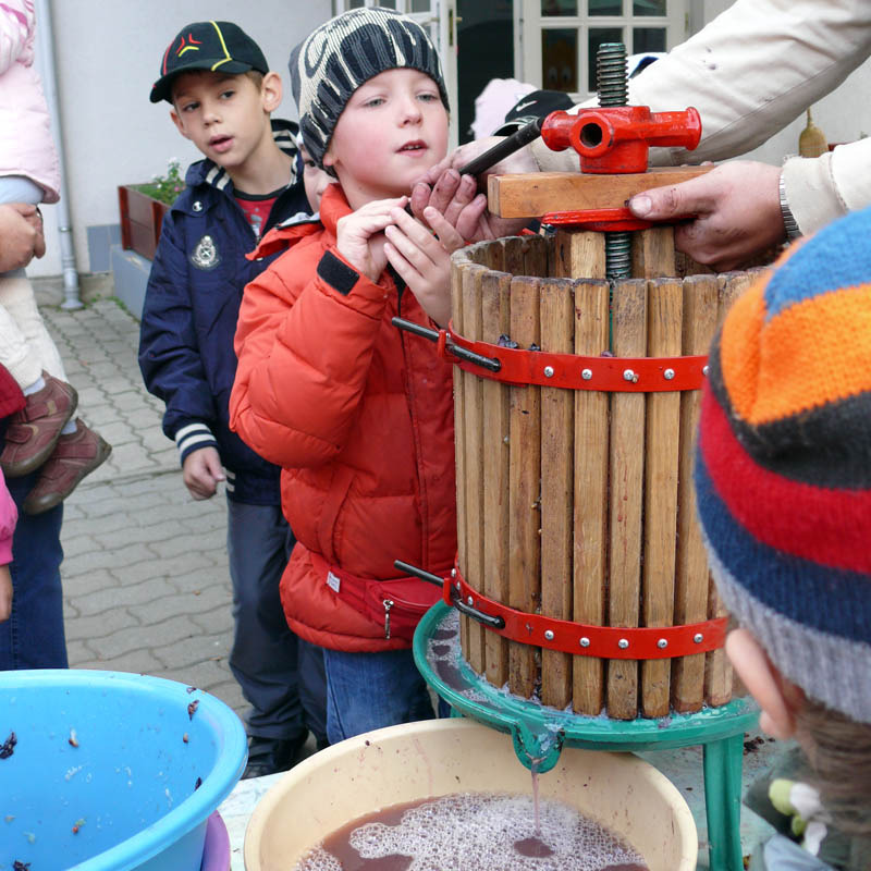 Szőlőszemezgetés, préselés és mustkóstoltatás mellett házikenyérsütéssel és szabadtéri babgulyás-főzéssel elevenítették fel a Németvárosi Óvodában a németvárosi szüretet. Az óvoda nevelési programjában a hagyományőrzést tűzte célul. Kis csoportokba rendeződve ki-ki népi játékok felelevenítésével múlatta az időt, kukoricát morzsolt, agyagozott, vagy éppen a kemencében sülő cipó vagy a rotyogó babgulyás előkészületei körül kotnyeleskedett.