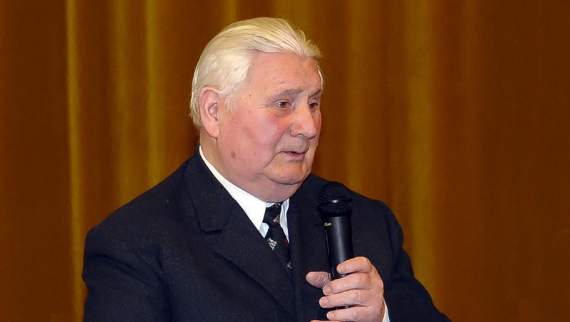 Az első ilyen előadás előtt kerestem fel. Bandi bácsi a színpadra helyezett asztalnál ült, jegyzeteit tanulmányozta. Noha minden a fejében van, a jobb szemléltetésért még fotókat is helyeztetett a színpadra, maga mellé.