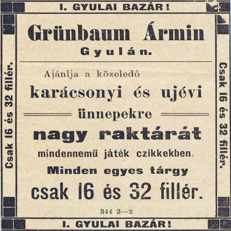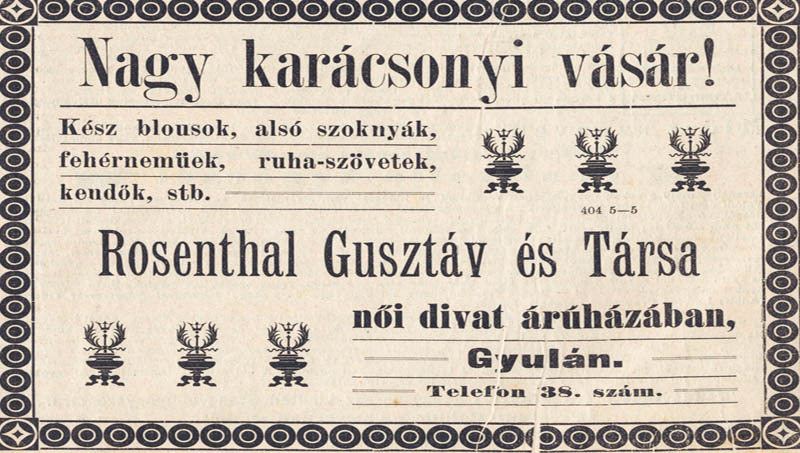 A téli időszakban az eddiginél is intenzívebb lett városunkban (is) a hirdetési kedv. Az érveléstechnika egyre kifinomultabbá vált, s az országos lapok nagy reklámozóinak színvonalát is megközelítette. „…a szerény hasznot már az olcsó bevásárlásnál biztosítottam, minek következtében áruimat minden versenyt kizárva meglepő olcsón adhatom, s így minden vevőnek saját érdeke, szükségletét üzletemben beszerezni” – hirdette az „Arany Csizmához” címzett gyulai üzlet tulajdonosa karácsony előtt, 1903-ban.