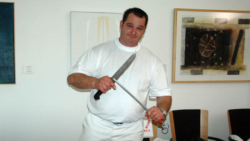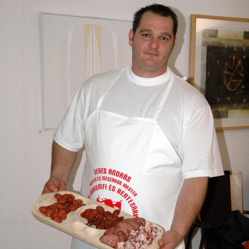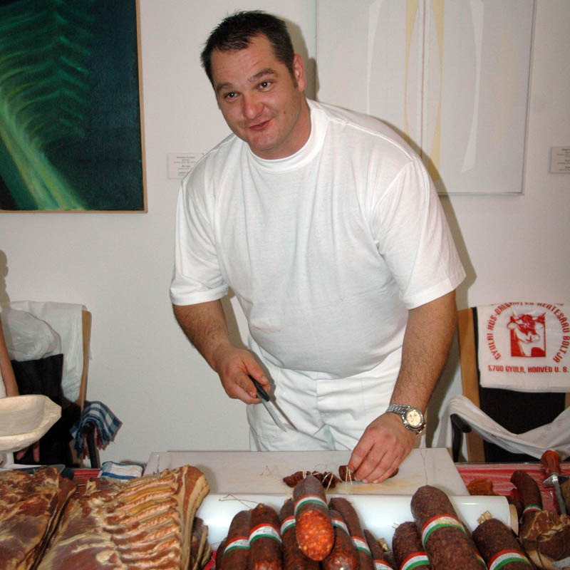 Először is fel kell készülni testileg, lelkileg (nevet). Kell egy jó disznó is, meg aki ért hozzá, egy jó mészáros, ha házon belül nincs, akkor egy hentest vagy böllért kell fogadni. A vágás következő fejezete egy kis bátorító elfogyasztása, már annak, aki iszik, ezután jöhet a leölés. Az uniós normákat követve elterjedtek a kábító eszközös vagy árammal történő disznóölések. Régen egy kötelet tettünk a malac szájába, kötél került a lábára, vagy még az sem, s felborítottuk, leszúrtuk, lemészároltuk a sertést. Nem volt ezzel több száz évig semmi baj, mert ez volt a módja, de az állatjólét miatt történtek változások. Megvallom, jobb is ez így. Egyrészt kényelmesebb, nem kínozzuk az állatot, meg segítség sincs már olyan, mint régen, hiszen anno házról házra járt az utca népe vagy a barátok. Egyik héten ide kellett menni lebirkózni a disznót, másszor egy másik házhoz. No, de ez régen volt… Szóval, megperzseljük a disznót gázperzselővel, utána pedig jöhet a sertés darabolása. Annak idején a levágott disznót meggyújtott szalmával perzselték, így leégett róla a szőr, megkapargatták, és úgy tisztították. Aztán változott ez is, bejöttek a faperzselők. Egy kis fémtartályba nagyon száraz fát tettek, azt meggyújtották, és egy nehéz, vasból készült ventilátort hajtottak kézzel, az így keletkezetett szórólánggal perzselték a disznót. Ez már fejlett technika volt a szalmához képest. A faperzselők után divatba jöttek a gázperzselők, amelyeket még mindig használunk a hagyományos házi vágásnál. Ez megkönnyíti a munkát, mert nem kell egy 15 kilós vasdarabot nyakban cipelni és földig hajolva perzselgetni a malacot. Míg perzselünk, a konyhában készül a híres disznótoros reggeli, a hagymás vér. A perzselés után tiszta vízzel, kefével megtisztítjuk, késsel fehérre kapargatjuk a malacot. Ez a kellemetlenebb része a disznóvágásnak, de hát a házépítésnél sem csak a téglát kell rakni, hanem a betont is keverni kell. A következő lépés a disznó felnyitása, darabolása, a belek, belsőségek eltávolítása, majd a hasítás. Utána jön a kívánság szerinti darabolás, orjára vagy karajra. Házaknál hagyományosan az orjázás az elterjedt, ez azt jelenti, hogy a gerinc egyben marad, és a gerinc két oldalán hasítják ketté a sertést. A gerinccsont a farkától a fejéig egyben marad, majd darabokra vágva orjalevest főznek belőle az asszonyok. Amikor karajra vágjuk, akkor megpróbáljuk középen széthasítani a sertést, és utána a karajt csontosan lehet szeletelni. Következik a szalonnák, húsok formázása, csontok fűrészelése, kolbász és hurka gyártása belsőségekből, fejből, szalonnából, nyesedékekből, de ebből lesz a disznósajt is. A kolbász természetesen a húsrészből és szalonnából készül, melyet mindenki kedve szerint fűszerez. Örömmel élem meg, hogy sokan rám bízzák a fűszerezést.