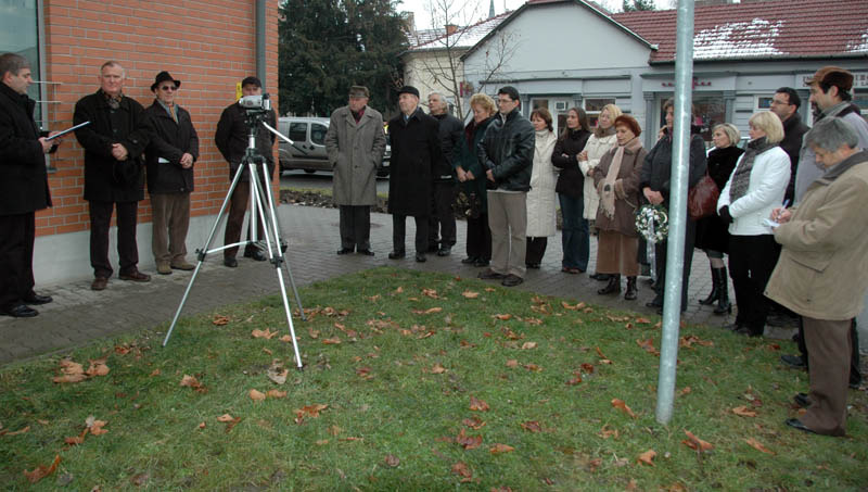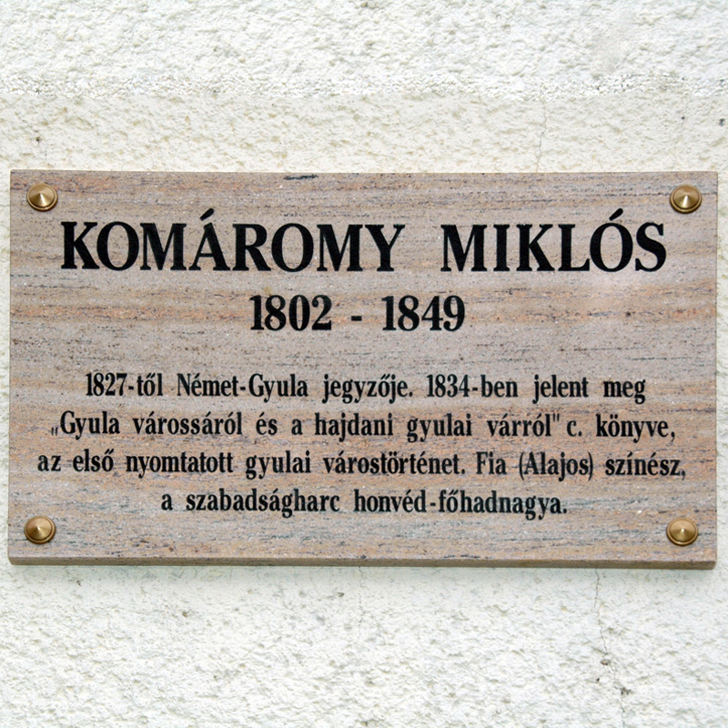 A koszorúk elhelyezése után az ünneplő közönség átsétált a másik színhelyre, a Komáromi és a K. Schriffert utca sarkán levő házhoz. A róla elnevezett utca okán itt tekinthető meg Komáromy Miklós emléktáblája, akinek érdemeit dr. Szabó Ferenc történész, nyugalmazott megyei levéltár- és múzeumigazgató méltatta. Komáromy megyei tisztviselő, majd az akkor még önálló Német-Gyula jegyzője volt. Gyulai tartózkodásának évei alatt írta meg azt a művét, amely miatt nevét az utókor megőrizte. 1834-ben jelent meg Nagyváradon a „Gyula városáról és a hajdani gyulai várról” címet viselő munkája, amely városunk első, könyv alakban megjelent története. Ecsedy Gábor református lelkész várostörténetét fejlesztette, kutatta tovább, újabb forrásokat is figyelembe véve. A Németvároson megbecsült jegyző életét személyes ellentéteken alapuló zaklatások terhelték, ezért Békéscsabára költözött, és ott is halt meg. Műve fontos szerepet tölt be várostörténetünk feltárásában.