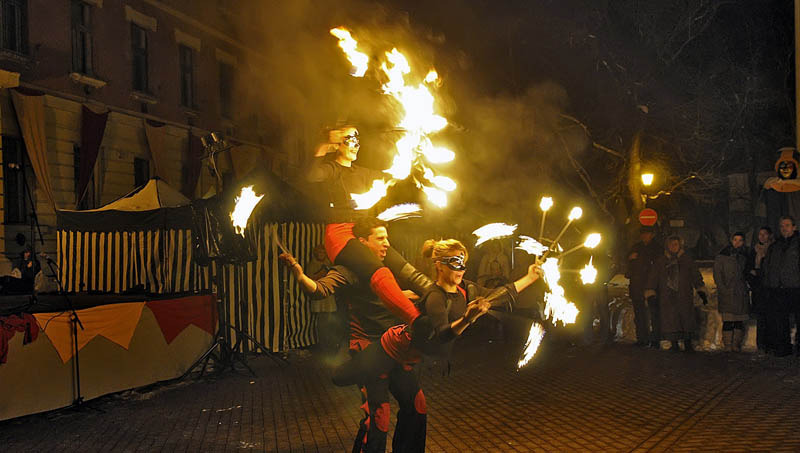 Akik bírták a hideget, a Csorvási Mazsorettek bemutatóját, majd a Bab Társulat előadását is láthatták. A belvárosi katolikus templom előtt tűzzsonglőrök dobálták a hidegben csábító forró lángokat, majd a Muzsikás Együttes műsora zárta a napot, akik intelligens humorukkal és széles zenei látókörükkel sok magyar vidék zenéjét mutatták be a népes hallgatóságnak.