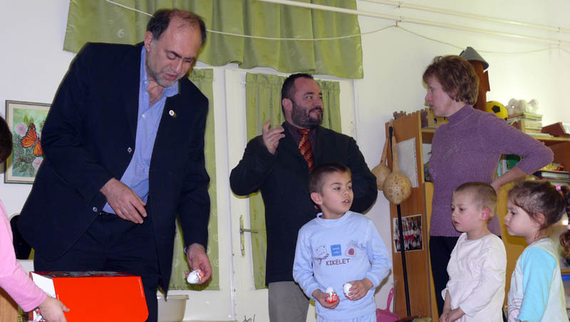 A idősek otthonában tett látogatás után a Bajcsy-Zsilinszky Úti Óvodába látogatott a két képviselő, ahol a délutáni pihenőjüket még éppen töltő gyerekeket kindertojással ébresztették.
