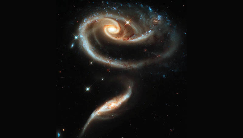 A Hubble Űrteleszkóp április 24-i születésnapján a NASA közzétett egy új felvételt, amelyen egy örvényszerű spirálgalaxis és a szomszédjának gravitációja hatására a világ legnagyobb virágát formázzák meg. A Földtől 300 millió fényév távolságra lévő Arp 273 jelű galaxispár az Androméda csillaképben található. A Hubble űrteleszkóp által készített felvételen az figyelhető meg, hogy a két spirálgalaxis külső spirálkarjai kölcsönhatásba lépnek egymással. A nagyobb galaxis az UGC 1810 jelzést kapta, míg a kisebbiket pedig az UGC 1813-ként katalogizálják. Az ütközés emberi léptékkel mérve hihetetlen lassúsággal zajlik, ugyanis a két csillagrendszert nagyjából tízezer fényév választja el egymástól.
