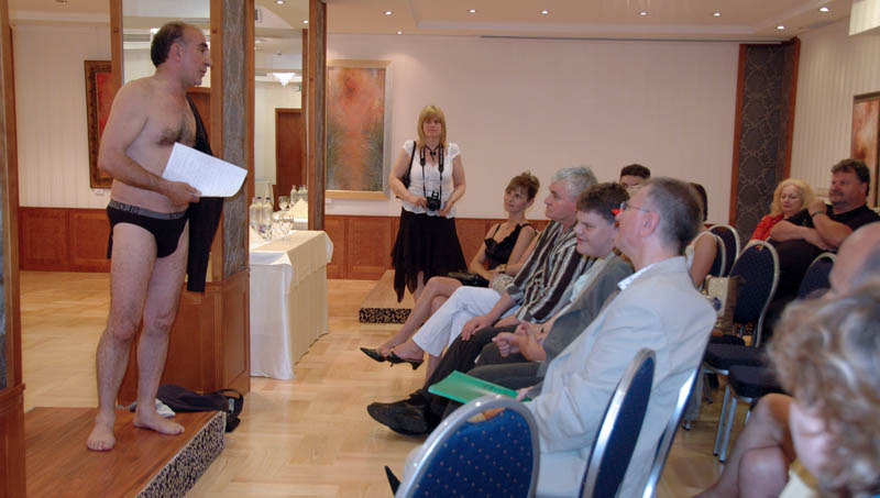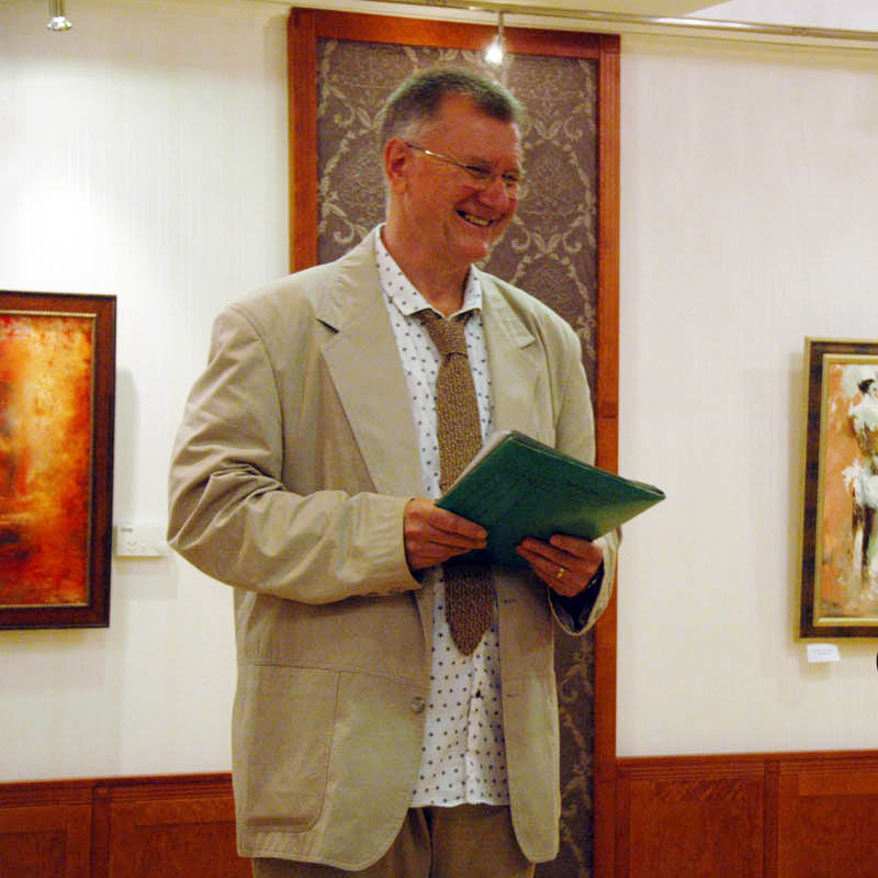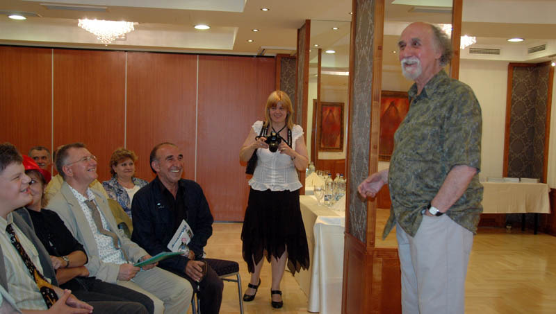 Az intelligens humort alkalmazó nevettető interaktívan, a közönséggel kedveskedve vagy csipkelődve vagy éppen látszólag kiiktatva, valós telefonálása közben adta be elbeszéléseinek finom élceit. A sokatmondó festményekből álló tárlat június 30-ig tekinthető meg az Elizabeth Hotel konferenciatermében.