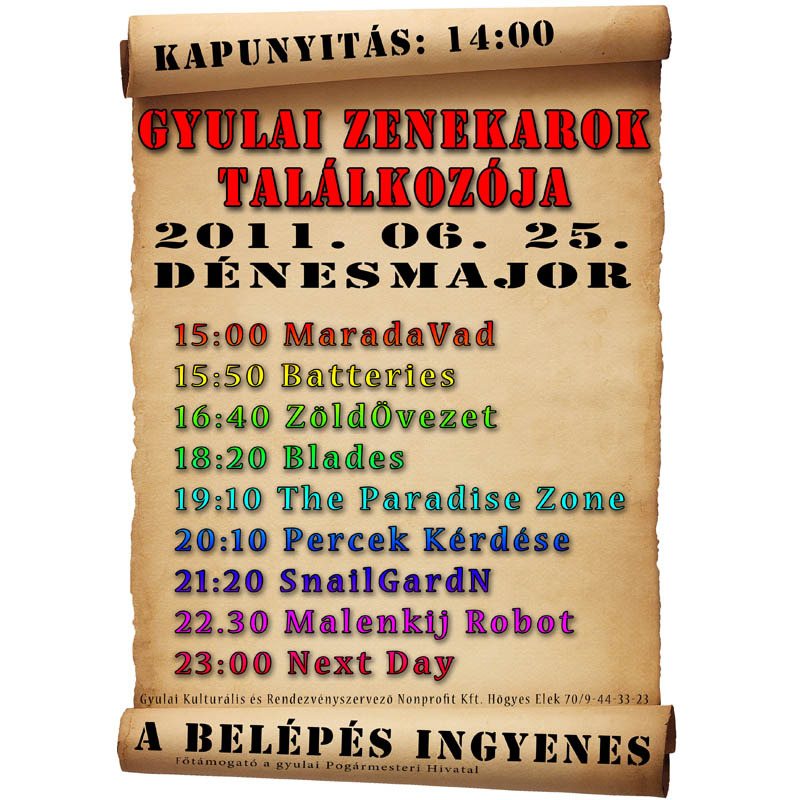 Az ingyenes koncerten több mint tíz zenekar gondoskodik majd róla, hogy sokszínű zene legyen hallható. 15 órától a MaradaVad, 15:50-től a Batteries, 16:40-kor a Zöldövezet, 18:20-kor a Blades, 19:10-kor a The Paradise Zone, 20:10-kor a Percek Kérdése, 21:20-kor a Snail GandN, 22:30-kor a Malenkij robot játszik. A koncertek sorát egy vendégzenekar műsora, a komádi Next Day fogja zárni, majd utána jam session (közös zenélés) lesz. Az ingyenes kisfesztiválon lehetőség nyílik sátrazásra, a Gyulai Hentesek Hagyományőrző Egyesülete pedig igazi gyulai sódart készít majd a jelenlévőknek.
