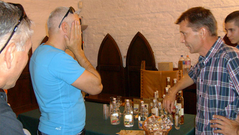 Néhány perccel öt óra előtt még semmi nem utalt arra, hogy a vár lovagtermébe meghirdetett gasztronómiai különlegességre az égvilágon bárki kíváncsi lenne. A gyulai idegenforgalmi szezon újdonságának számító állandó programok egyik résztvevője, Tóth János, a sarkadi Éden Pálinkaudvar képviselője azonban nem volt ideges. Ő kizártnak tartotta, hogy a Gyulai Hentesek Hagyományőrző Egyesületének kolbásza, illetve a sarkadi kisüsti pálinka kóstolási lehetősége ne csalogatná be az érdeklődőket. És milyen igaza lett! Néhány perc múlva népes csapat érkezett, majd egyre újabb vendégek állták körül az asztalt, kóstolták a finom falatokat, az ízletes gyümölcspárlatot.