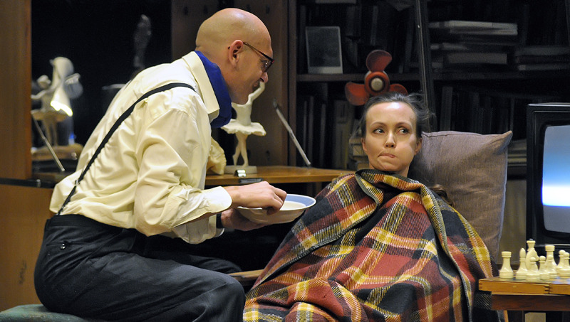 A Koršunovas korábbi előadásait szinte kivétel nélkül jellemző sokszereplősség és csapatmunka helyett a Mirandában csupán két színészt látunk, akik hihetetlenül koncentrált művészi munkával önmaguk legmélyéből hívják elő karaktereiket. A zseniális szerepváltásokat az egyes figuráknak (a helyenként eltúlzott karikírozás ellenére is) rendkívül finom megformálása teszi lehetővé. Airida Gintautaite visszafogott eszközökkel jeleníti meg a testi és szellemi fogyatékos Mirandát, aki nyomorék kezével igyekszik utánozni a kis balerina-szobor kéztartását, fél-artikulátlanul ismételgeti, hogy nem Calibant akarja látni, hanem Ferdinandot. Ariellé változását már előrevetíti az a gesztus, amikor az apa még csak a Vihar „személyeit” olvassa fel, s a légi szellem említésekor a lány hátrafordulva belenéz az elemes bútorba rejtett tükörbe. A majd’ 50 éves Povilas Budrys hihetetlen zsenialitással alakítja egyik pillanatban a (belső) száműzetésbe kényszerített, frusztrált feszültségét vodkával enyhítő ellenzéki Prosperót, a förtelmes ösztönlény Calibant és a nyegle modoros Ferdinandot. A szerepek – akárcsak az előadás szintjei – időnként összecsúsznak, nem választhatók szét élesen a Budrys által megformált karakterek – s nem is kell szétválasztani azokat, hiszen a különböző értelmezési szintek és az egyes szerepek egymásra vetülnek, összefolynak, kölcsönösen erősítik és gyengítik egymást.