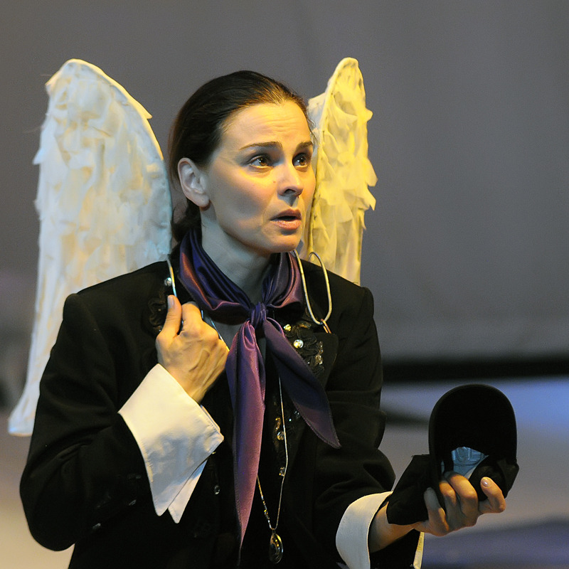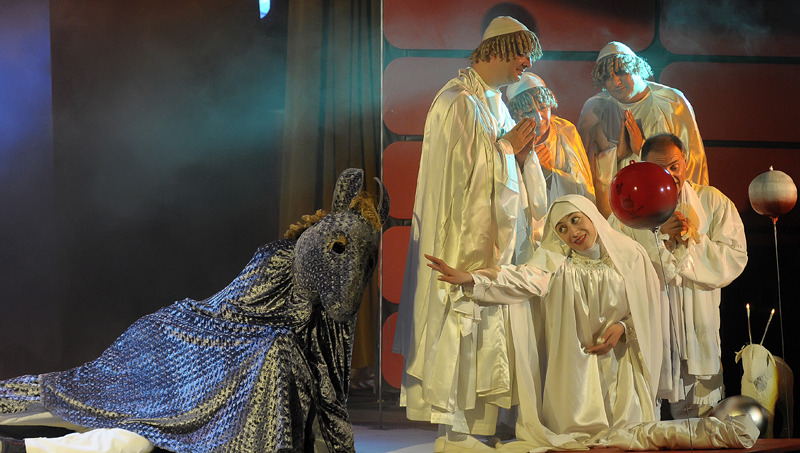 A bibliai történet mozzanatai a színpadon párhuzamosan zajlanak az Illyriában játszódó történettel. Mindez – a díszleten, a jelmezeken és a zenei betéteken kívül – hozzájárul ahhoz a különleges atmoszférához, amely körüllengi a darabot. A manézs világát idéző, sokszor bohócjelmezekre emlékeztető ruhák, léggömbök mellett ugyanis jelen vannak a színpadon a misztériumjáték kellékei is, a műbárányok, az angyalszárnyak, a csillagos eget ábrázoló függöny. A grúz rendező jól használja ki a színpad nyújtotta lehetőségeket: a színészek hol föntről ereszkednek alá, hol a színpad alól sétálnak fel a felszínre. A darab misztikus hatását fokozza a bibliai jelenetekben a füstgép gomolygó, ködszerű, felhőszerű füstje, valamint a folyton ismétlődő, egyedi zenei elemek.
