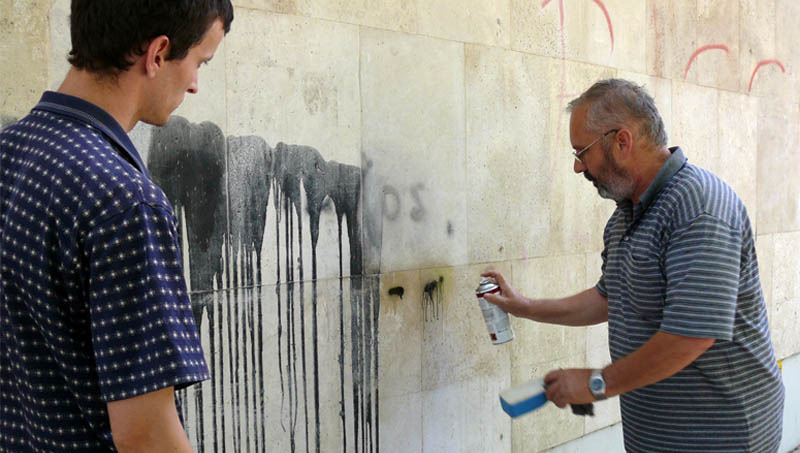 Lehet gránit, márvány, kő vagy faburkolat, a graffiti festék a pórusokig hatol. Nagyon nehézkes a tisztítás, de ha mégis sikerül a beavatkozás, a burkolat színe is jelentősen kivilágosodik – tudta meg a Gyulai Hírlap Online.