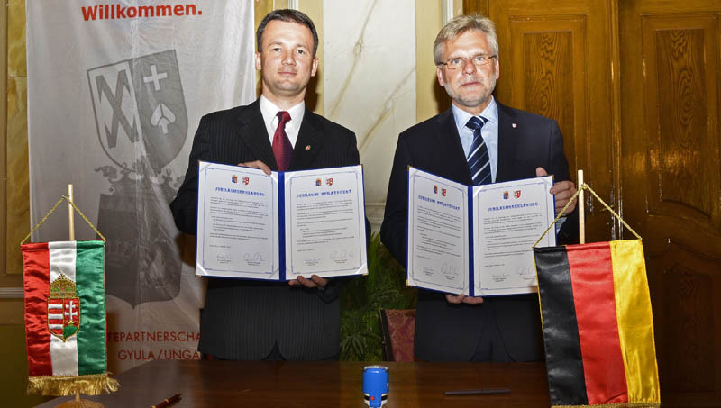 Ma már a feledés homálya fedi, hogy pontosan miképpen is esett a választás Gyulára, az Alföld délkeleti részén található fürdővárosra. Talán valaki járt már itt és mesélt Herr Fögennek, talán egy prospektus jutott el a főpolgármester kezeihez, talán a német követség keresett a Ditzingenhez passzoló méretű partnervárost – ma már csak kevesen tudják. Tény az, hogy Alfred Fögen megkereste az elképzeléssel az akkori tanácselnököt, Takács Lőrincet. Megkezdődött a kapcsolatok kiépítése, egymás megismerése. A folyamatot a magyar rendszerváltás sem tudta megakadályozni, s 2001 októberére megszületett az együttműködés kereteit meghatározó dokumentum, melyet a felek alá is írtak. Ennek az emlékezetes aktusnak ünnepelték a huszadik évfordulóját előbb májusban Ditzingenben, majd most, október verőfényes első hétvégéjén Gyulán.