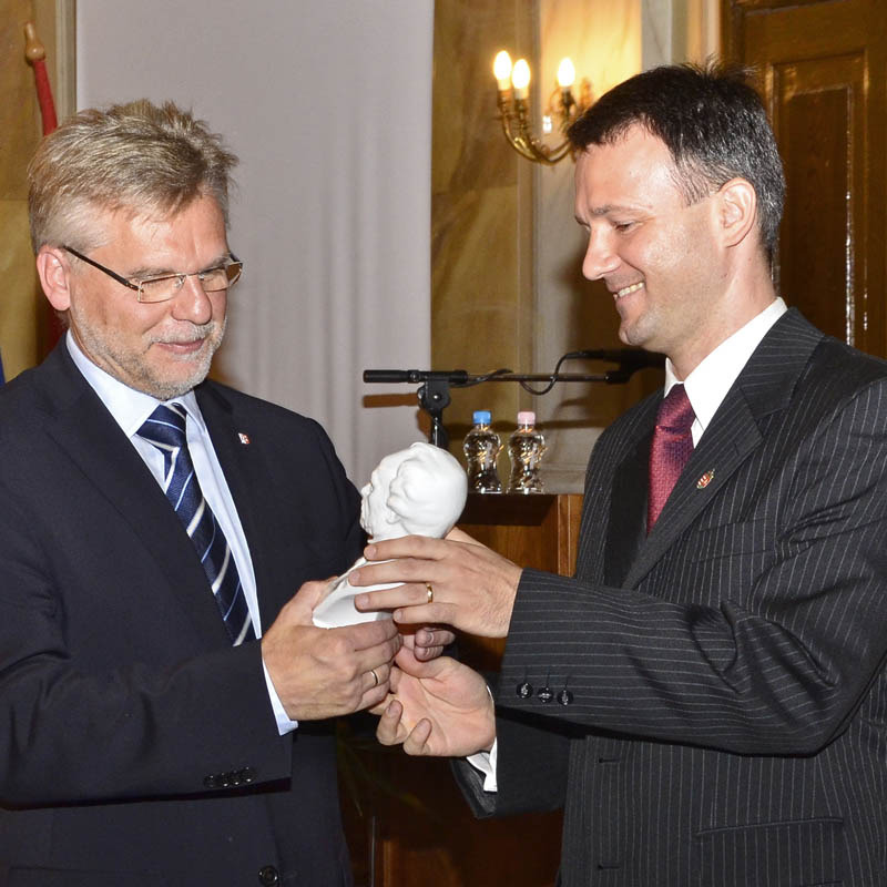 A nap fénypontja kétségtelenül Ditzingen város ajándékának átadása volt. Német barátaink a legöregebb ditzingenit hozták el nekünk. Elkészíttették a világhírű Hirschlandeni harcos névre hallgató 2500 éves kelta szobor élethű másolatát, melyet a Dürer teremben kialakított kelta elemekkel díszített környezetben állítottak fel. A szobor szinte minden kelta művészetről szóló kiadványban szerepel, Hirschlandenben találták meg egy halomsír feltárásakor.
