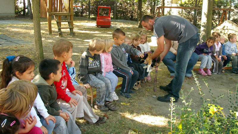 Másnap izgalommal vártuk a kis négylábú vendégekkel, Maja, Lili, Lokni kutyákkal, Szani cicával, a foltos nyuszival letakarva a meglepetéssel érkező szülőket. Zoli bácsi elmondta, hogy a kutyák is iskolába és óvodába járnak és sok-sok törődést igényelnek, akár csak mi. Felhívta a figyelmünket arra, hogy az állatok lehetnek az ember barátai is, de viselkedhetnek ellenségesen is, ezért mindig fontos, hogy mielőtt megsimogatnánk, játszanánk velük, mindig kérdezzük meg a gazdájukat, szabad-e? Kerítésen ne nyúljunk be, hiszen nem ismerhetjük az állat reakcióit.