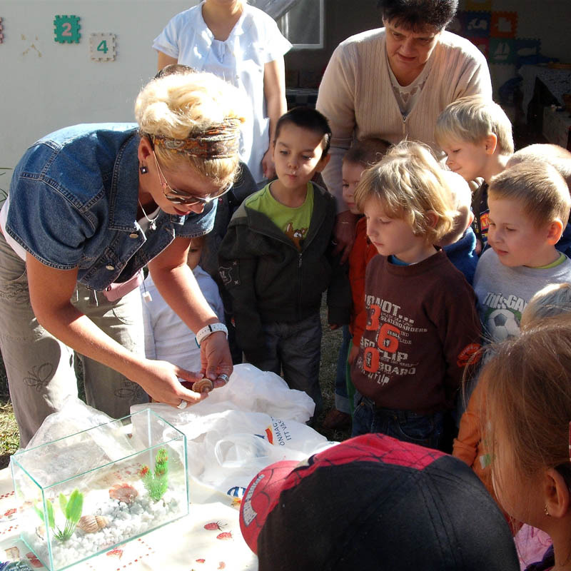 Ezután következett az igazi meglepetés. Andi néni segítségével akváriumot készítettünk, és a „Pötyi” nevet adtuk a harcos halunknak, amely az óvodánkban maradt és gyakorolhatjuk általa az állatokról történő mindennapi gondoskodást.