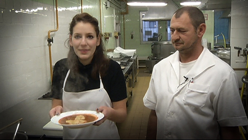 Ennyi mozgás után igazán jólesett egy pár falat. A Gyulakonyha már előkészítette a hozzávalókat. Mi más is lehetne a menü egy decemberi Spirituszban, mint karácsonyi ételek. Kovács Sándor szakács megmutatja, hogyan lehet szinte percek alatt ünnepi vacsorát készíteni. Körösi halászlével nyitottunk, majd vajon párolt zöldfűszeres pulykamellcsíkok következtek. Az egész ebéd elkészítése és elfogyasztása nem volt több negyven percnél, tehát akinek még nincs ötlete, mit is varázsoljon az asztalra karácsonyra, mindenképpen nézze meg a decemberi Spirituszt.