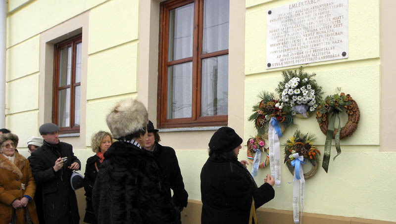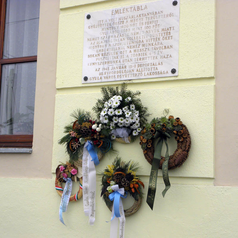 A málenkij robotra elhurcoltakról emlékeztek meg ma délelőtt a Harruckern középiskolánál, a volt huszárlaktanya falára elhelyezett emléktáblánál. A koszorúzással egybekötött rövid megemlékezésen Tóth Tibor szavalata után Mittag Mónika, a Gyulai Német Kisebbségi Önkormányzat elnöke köszöntötte az egybegyűlteket.
