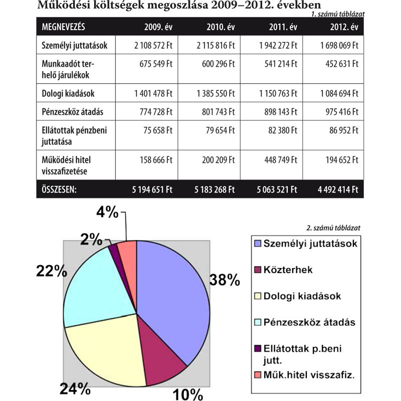 A kiragadott példák is mutatják, hogy meglehetősen összetett, nagy felkészültséget, ezzel együtt jelentős költséget igénylő feladatokról van szó. Az önkormányzati költségeket több szempont alapján csoportosíthatjuk. Az egyik ilyen csoportosítás a jogcím szerinti bontás. Attól függően, hogy kire-mire költi az önkormányzat a működési célra rendelkezésére álló pénzt: Működési költségek megoszlása 2009–2012. években – 1. számú táblázat. Kördiagram segítségével szemléltetve a 2012. év működési költség összetételét – 2. számú táblázat.
