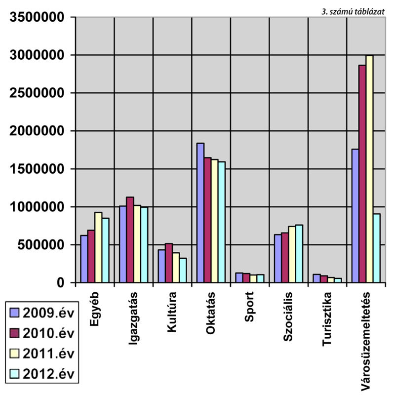 A költségcsoportok az adott tevékenység ellátását végző apparátusok bér- és egyéb költségeit, valamint az egy-egy terület fejlesztési ráfordításait tartalmazzák. A torzítások kiszűrése érdekében az egyéb feladatok ráfordításait csökkentettük a kötvénykibocsátásból származó, kamatozási célból lekötött pénzösszeggel. A feladatokra ráfordított pénzeszközök alakulását mutatja a következő diagram – 3. számú táblázat.