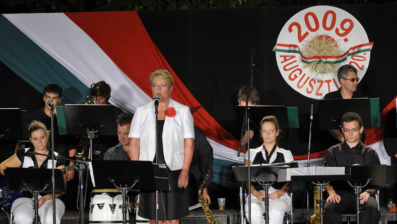 Közben a Himnusz eléneklése után dr. Perjési Klára polgármester, országgyűlési képviselő köszöntőjében üdvözölte a jeles nap sokféle ünnepét, beszélt azok kialakulásáról, történelmi változásairól. Hangsúlyozta az Államiságot, az Alkotmányt, a Szent Jobb történetéről is beszélt, és az új kenyér ünnepéről is megemlékezett.