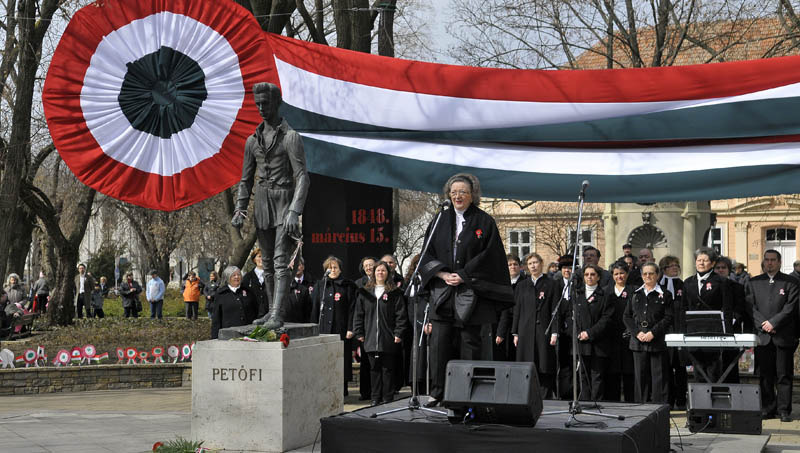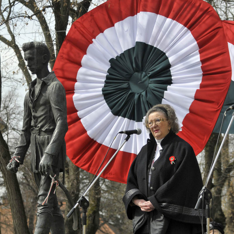 – Minden olyan esemény, ami a múltban lezajlott és a jelenig hat, számunkra azért fontos, mert mindig össze kell kapcsolnunk azzal, hogy most mit csináljunk ebben a jobb sorsra érdemes hazában, mit csináljunk, hogy meg tudjuk magunkat tartani, hogy azok az eszmények, amelyek a magyarság szívében évszázadok óta éltek, fokról fokra, szép csöndesen, de határozottan megvalósuljanak – mondta ünnepi beszédében Jókai Anna.