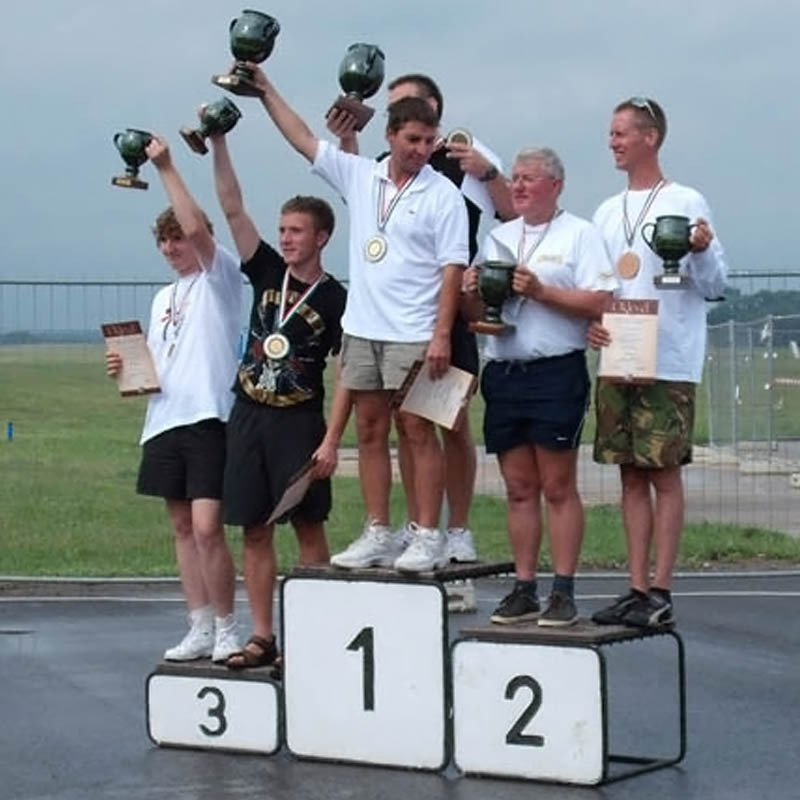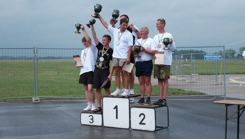 A gyorsasági kategóriában a Dobos István Modellező Klub tagja, Elekes Imre a negyedik helyen zárta a versenyt, míg túra csapat kategóriában Márkus oldalán a hetedik helyen végzett. A Bumacofly két versenyzője, Orvos Ferenc–Kasoly Attila-páros (képünkön) a túra csapat kategóriában a dobogó legfelső fokára állhatott, ezzel első helyen várhatják a világkupa utolsó fordulóját, melyet szeptember 20-án rendeznek Franciaországban. A klub két fiatal tehetsége, a Flender–Szász-kettős tavaly még junior színekben indult, ezen a versenyen azonban már a felnőttek között is bemutatkozhattak, és az ötödik helyen fejezték be a küzdelmeket. Hétvégén Szász Balázs Orvos Ferenc oldalán Angliában szerepel majd a Brit Nemzeti Bajnokságban, ahol még magyar versenyző nem járt, nekik sok sikert kívánunk.