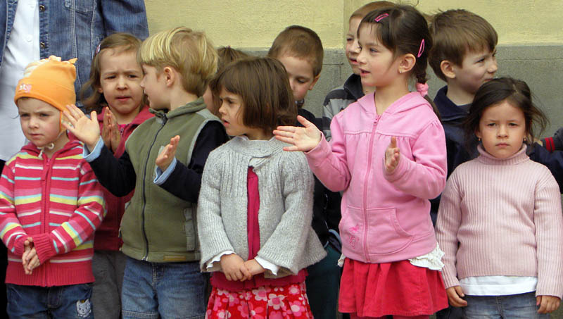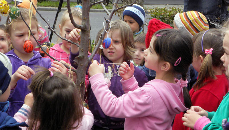 Ragyogó tavaszi napsütésben állítottak tojásfát a németvárosi óvodások és az Implom József Általános Iskola német nemzetiségi osztályának tanulói ma délelőtt az Apor téren.