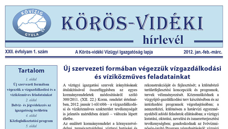 Megjelent a Körös-vidéki Vízügyi Igazgatóság lapja, a Körös-Vidéki Hírlevél, XXII. évfolyam idei 1. száma – tájékozatta a Gyulai Hírlap Online-t Bak Sándor, a vízügyi igazgatóság vezetője. A negyedévente, elektronikus formában megjelenő lapban olvashatnak az igazgatóság új szervezeti formájáról, a közelmúlt belvíz- és jégvédekezéséről.