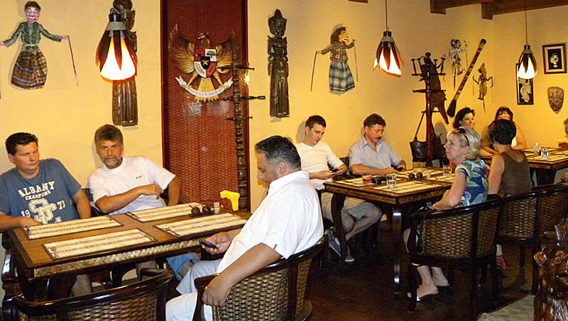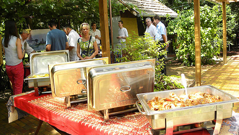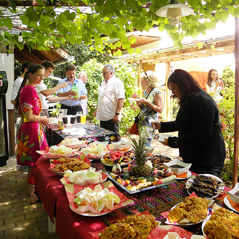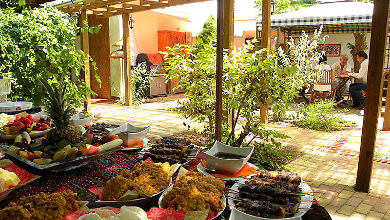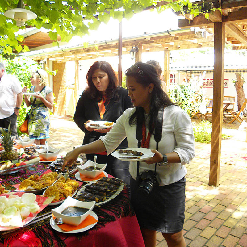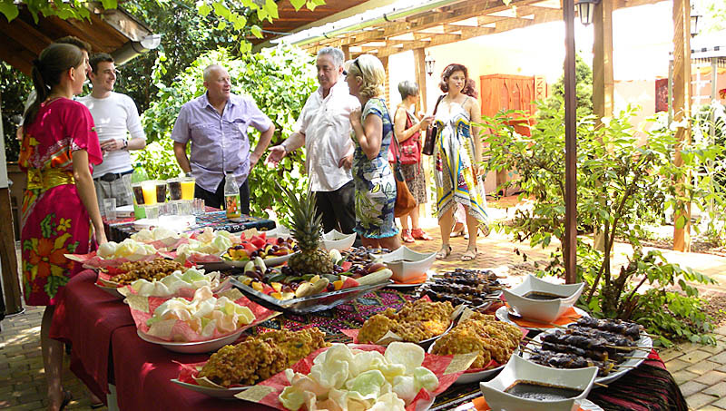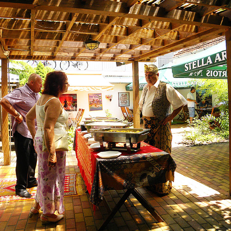 Az előadás után a jelenlévők olyan indonéz ételkülönlegességeket kóstolhattak meg az étterem kerthelyiségében, mint az ayam rica-rica, Wyauhni néni zöldséges harcsája vagy a hakwan, amely egy indonéz rágcsálnivaló. Az állófogadáson ezenkívül sate ayamot, nasi gorenget, nasi putihot és mogyorószószt kínáltak a vendégeknek.