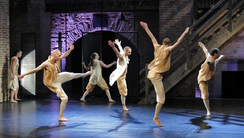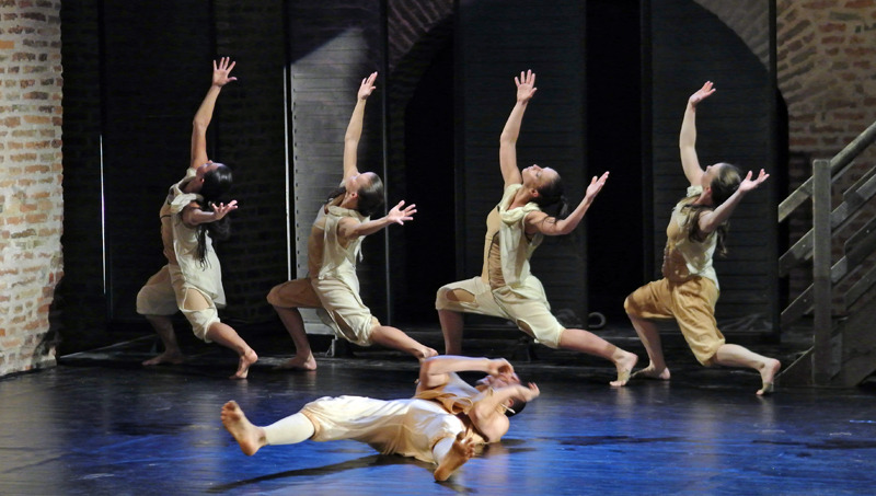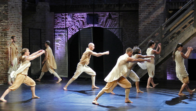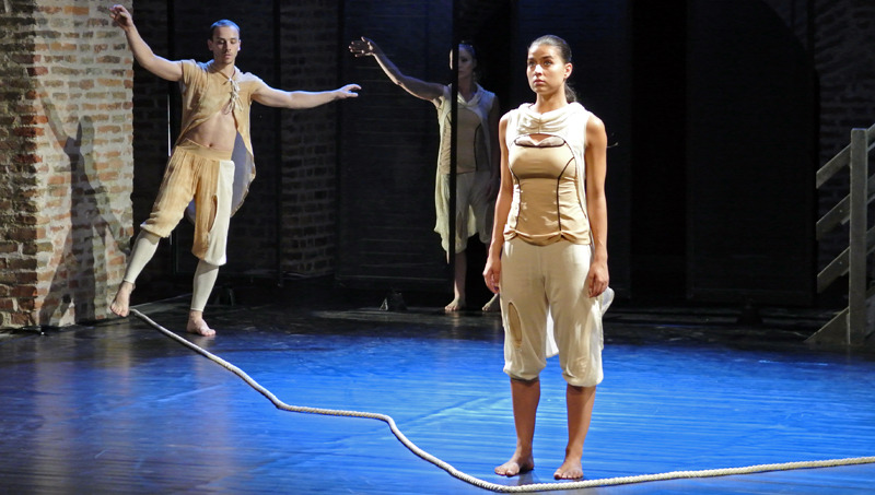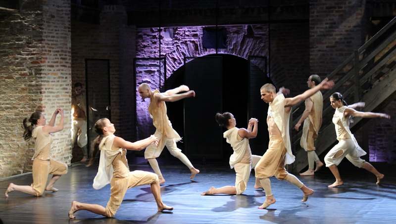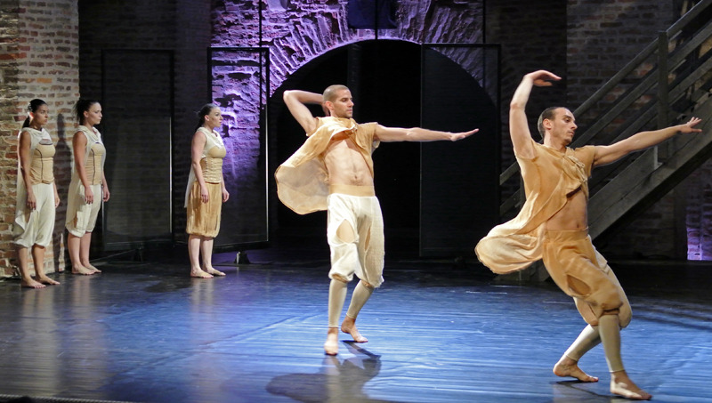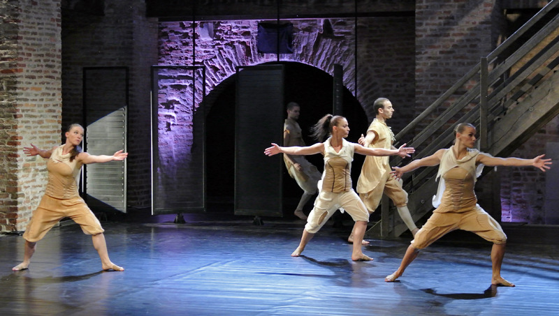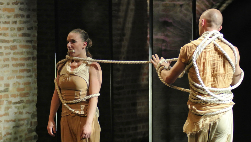 A tánccsoport – Eller Gusztáv, Frigy Ádám, Hargitai Mariann, Horváth Adrienn, Katonka Zoltán, Mádi László, Molnár Zita és Palcsó Nóra – a díszlet és a vár adottságain túl, egyre több emblematikus kellékkel szerelte fel a színpadot. Kötelek különböző mozdulatokban jelképezték a rabságot, a kötődést, az összefonódást, az önostorozást, az ellenségeskedést és a szeparációt. Két fatönköt cipelő szereplő jelent meg, egyikük átadta terhét társának, aki azokat összekötözve, az így biztosabb építményre állt és lassú forgásba kezdett. Eközben társa kötelességtudóan és állhatatosan hozta kezébe a homokot, amely kíméletlenül és végtelenül szóródott szét a színpadon.