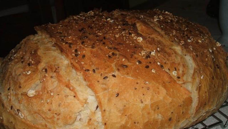 A hozzávalókat a víz és az olaj kivételével egy tálban szárazon elkeverem, majd hozzáadom az olajat és annyi langyos vizet, amennyivel jól gyúrható lesz a tészta (kb. 2- 2,5 dl). Jól összedolgozom, és tíz percig dagasztom. Egy, az előbbinél nagyobb tálba engedek forró vizet, és a kisebb tálat benne a tésztával beleteszem. Ruhával több rétegben betakarom úgy, hogy a ruha a nagyobbik tálat is teljesen eltakarja. Egy órán át hagyom így kelni, majd az óra leteltével átgyúrom, és ismét kelesztem ugyanezen a módon egy órán keresztül. A szépen megkelt tésztát sütőlapra teszem, a tetejét tejjel megkenem, és tejbe áztatott tökmag, napraforgómag és lenmag keverékével jól beborítom. A sütő aljába egy lapos edénybe kb. 2 dl vizet teszek, és a kenyeret hideg sütőbe téve közepes lángon kb. 50 percig sütöm. Gyönyörű fényes lesz a kenyér, ha elkészülte előtt pár perccel vízzel jó alaposan megspriccelem, majd készre sütöm. A kenyeret kihűlése után pamut ruhába vastagon becsavarva, akár egy hétig is finom marad.
